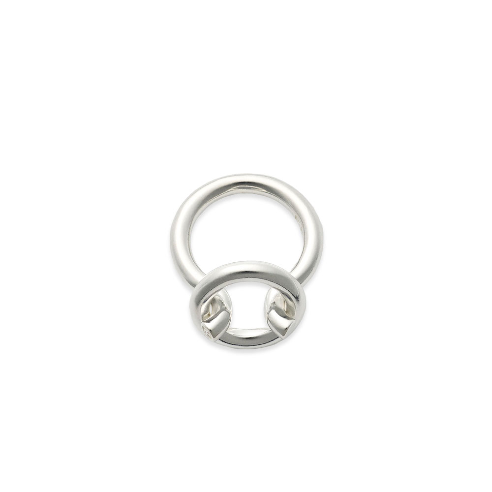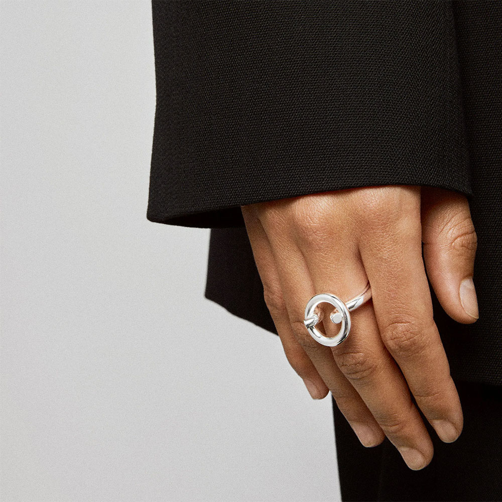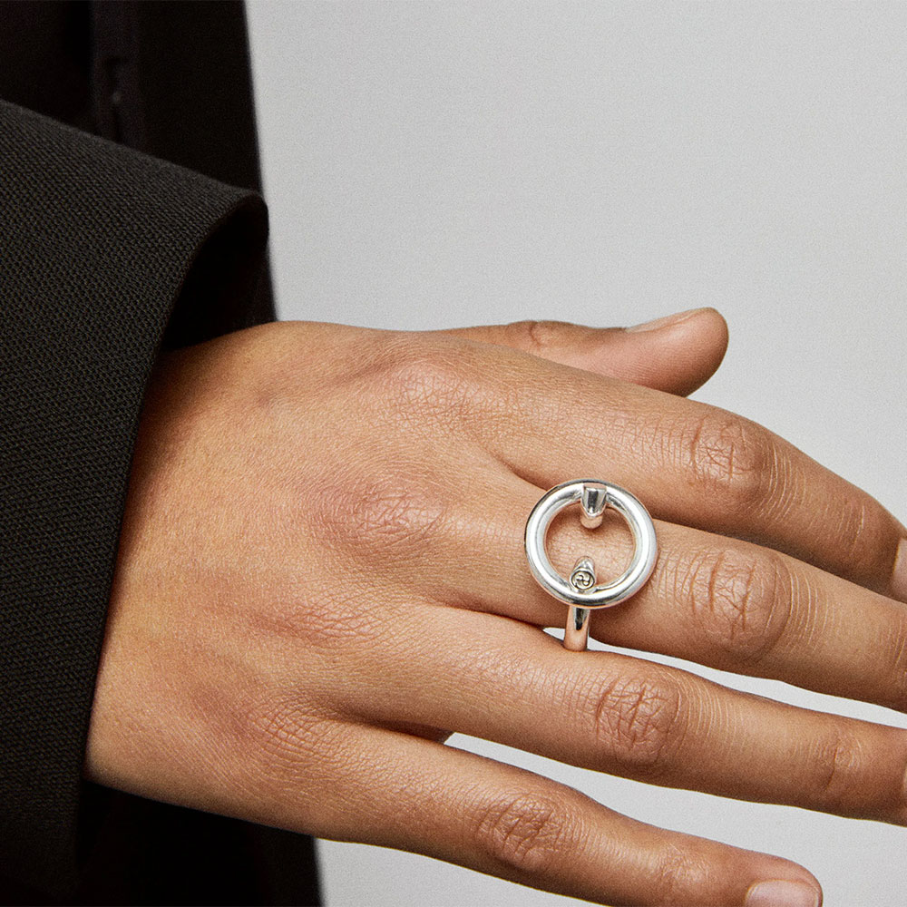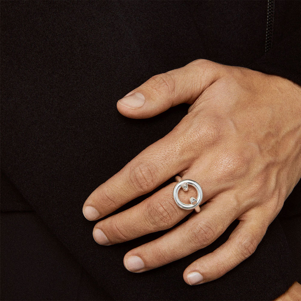 リングにリングを通したようなデザインが特徴の新型。新型線の細い表情ながら強い印象を残す、ALL BLUESらしい塩梅でエッジを効かせた仕上がり。