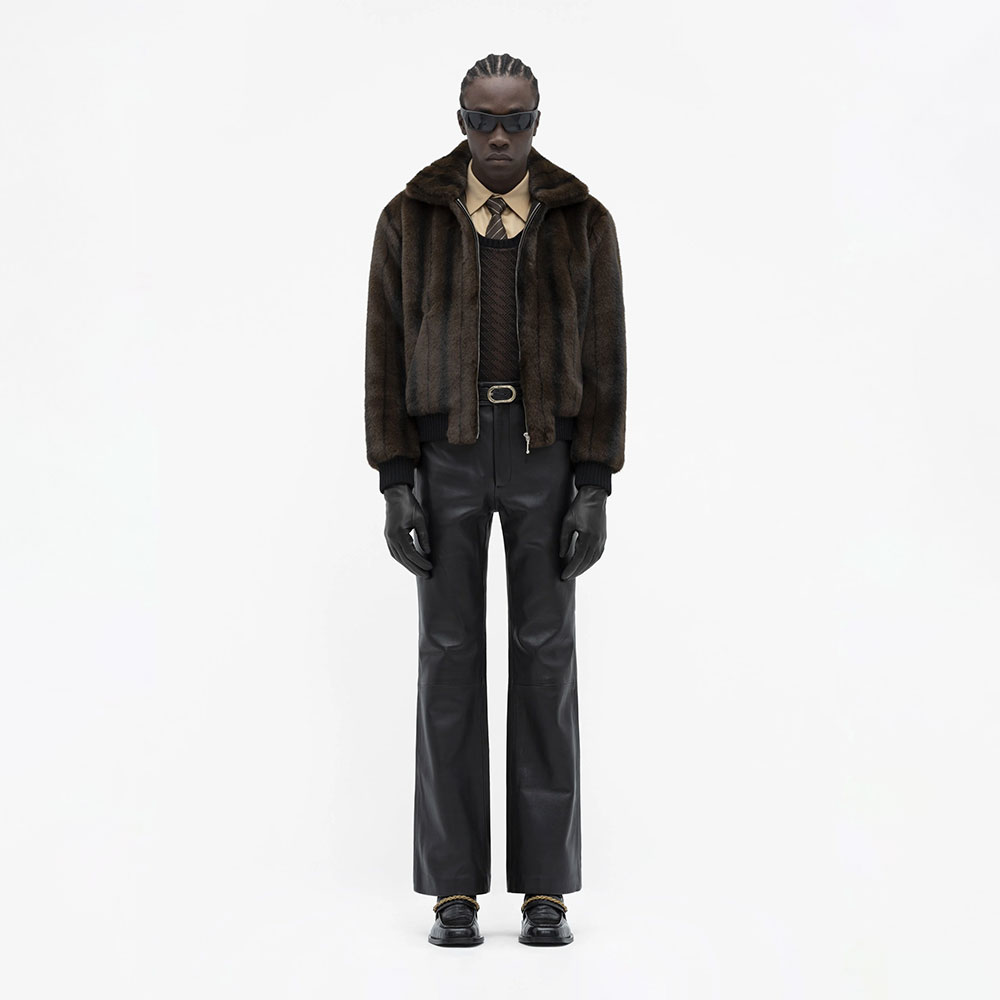 フェイクミンクファーのショートジャケット/ブルゾン。襟つき。ジッパーフロント。ウェルトポケット。裾と袖口はブラックのリブ素材。サテンの総裏地で滑らかな着心地。このブランドらしいコンパクトなフィット感で、ユニセックスで着用可能。