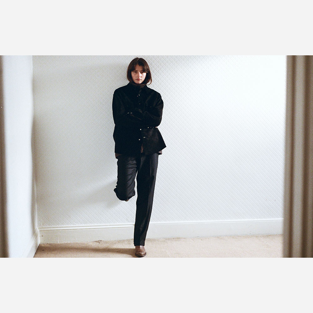 リラックスシルエットのウエスタンシャツが、スエード素材で再登場。ウエスタンヨークや胸ポケットといったディテールを、同系色のステッチとブラックのフェイクパールスナップボタンが際立たせるデザイン。ややオーバーサイズの仕立てなので、季節の変わり目のアウターとしても着用可能。ユニセックススタイル。