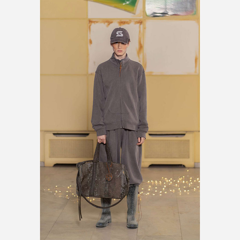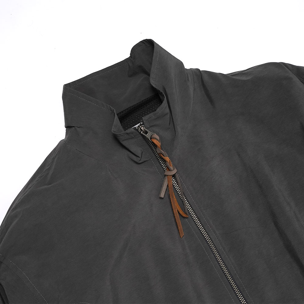 アイテム名の通り波状のバックデザインが特徴的なトラックジャケット。ジップ部分には編み込みのレザーストラップ