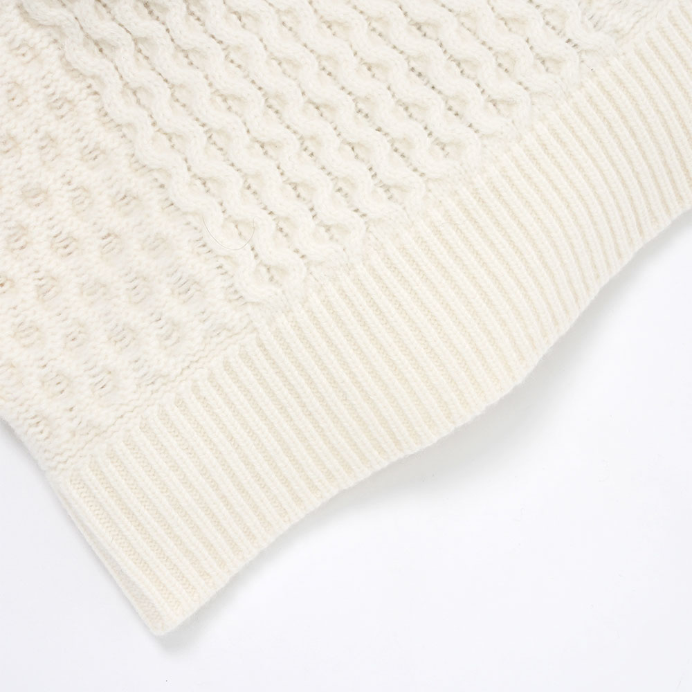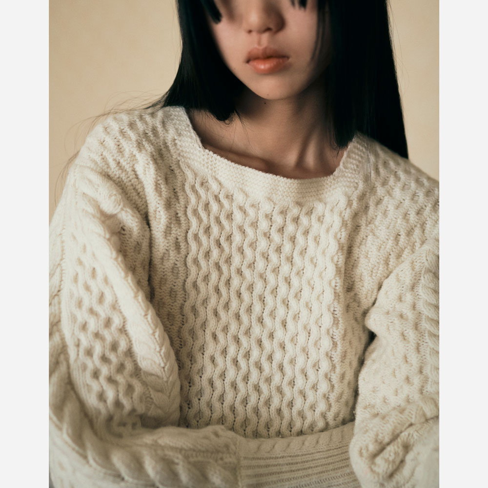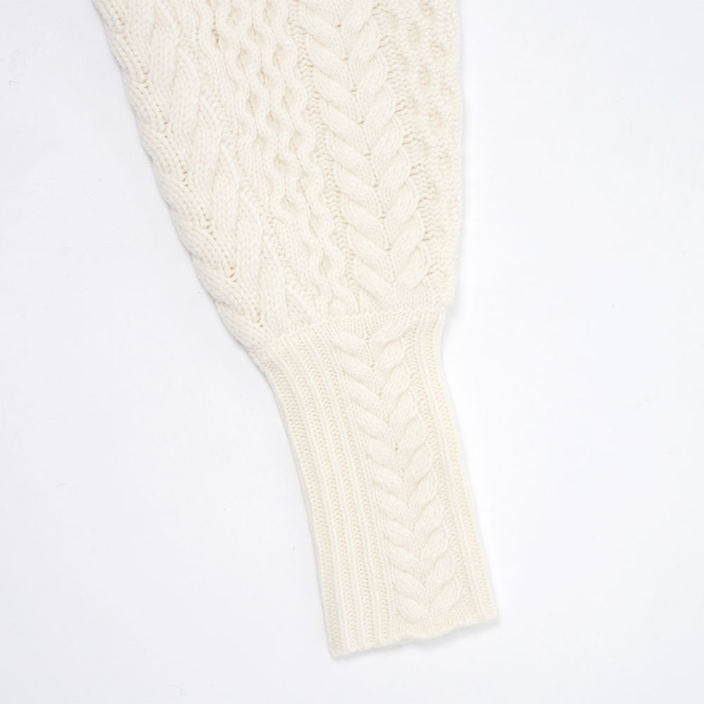 ケーブル編みやワッフル編みを用いたビクトリアンスリーブのプルオーバー。ウエストリブのスカート付きで、ワンピースのようにも演出できます。単品として