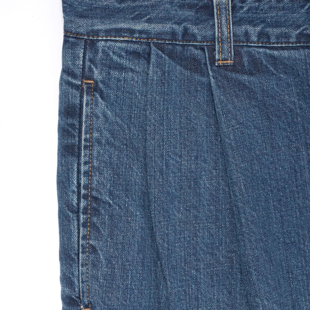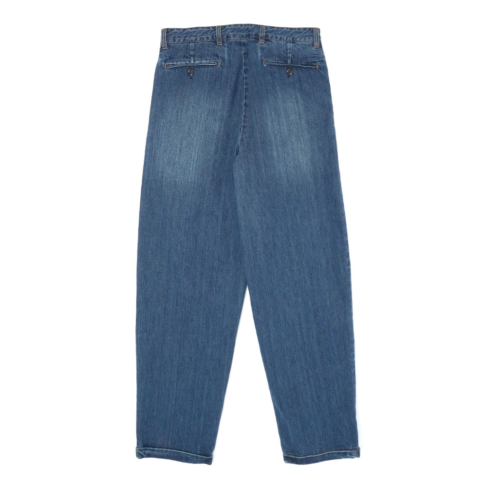 100%コットンを使用したツータックデニムパンツ。デニム本来の無骨さを保ちつつ、スラックスのような上品な印象を与えてくれる一本。古着との相性は勿論、ドレッシーなコーディネートにも相性抜群。テーパードシルエット。