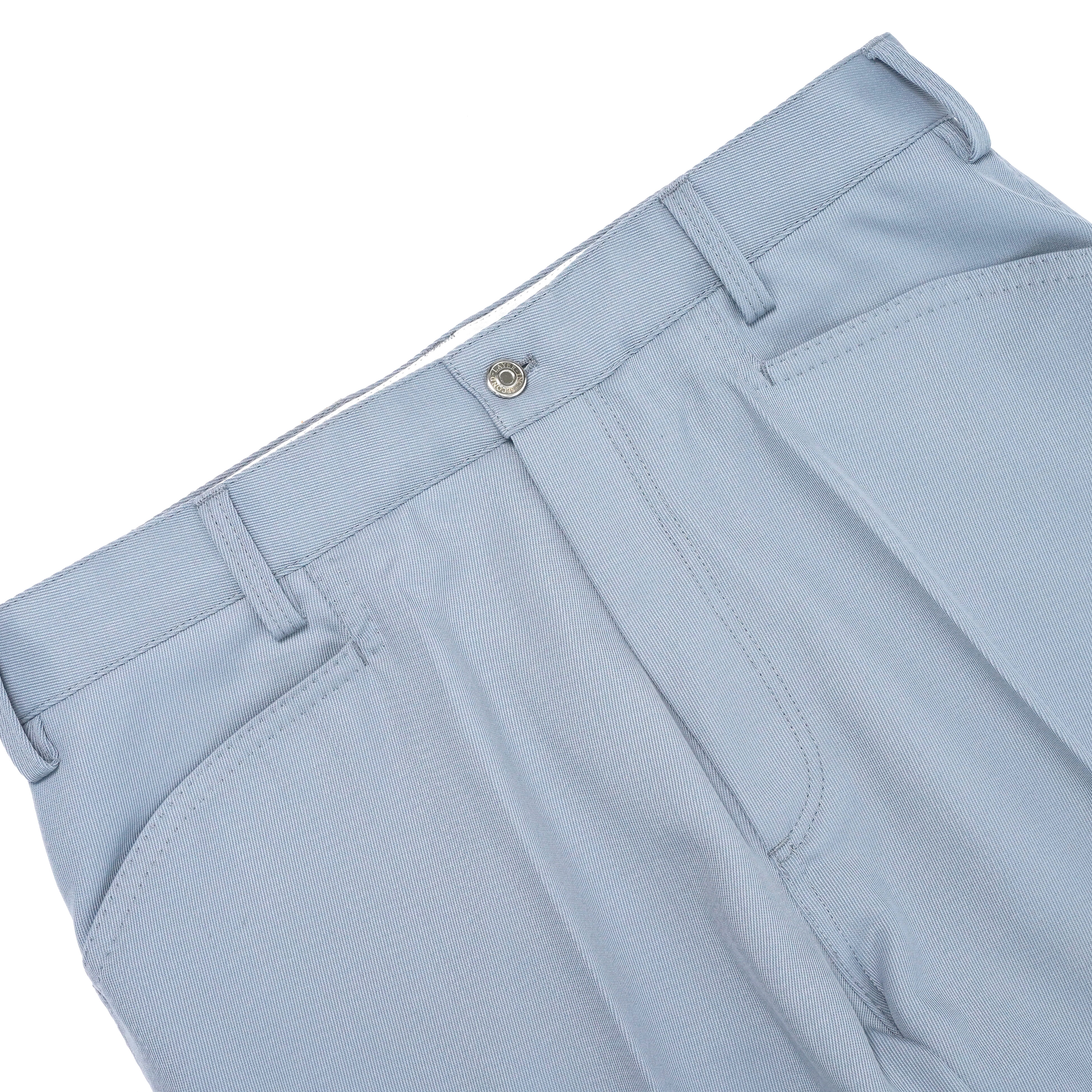 ブランド定番のワイドトラウザーのシーズンカラーモデル。VALLUCOトラウザーに比べワタリを太くし、よりストレートに近い微フレアなカット。立体的で嫌味のない美シルエット。フロントオープンポケットの緩やかな曲線、センタークリースも特徴。イタリア製。
