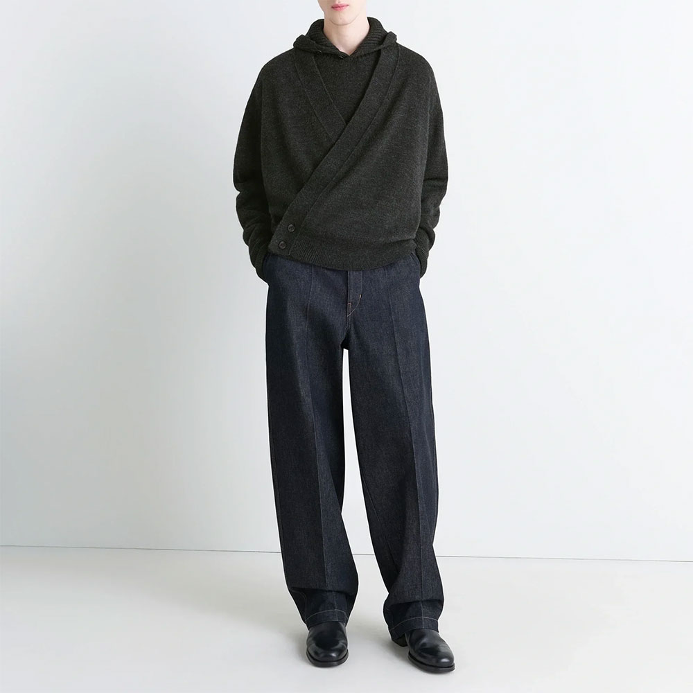 ウールとアルパカの上質で温かみのあるブレンド素材で仕立てられたラップカーディガン。着物の襟元を思わせる、オリエンタルな趣のデザインが特徴。ブラウンを基調に、チャコールやカーキが繊細に溶け合った奥行きのあるカラーリングも魅力。快適さとエレガンスの融合というブランドの美学を体現した一着。