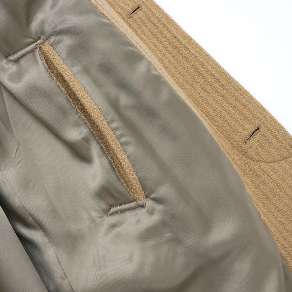 Super120's原料の細番手梳毛TOP糸を使用して織り上げた、存在感のある太畦ツイード素材です。裏面には伸縮性のある素材を貼り合わせ、特殊な技術を駆使して、天然繊維だけでは表現できない独特の質感を実現しました。表面は上質なウール特有の風合いを持ちながら、内部にはスポンジのような弾力性があり、柔らかさとしっかりとしたボリューム感を兼ね備えた素材です。