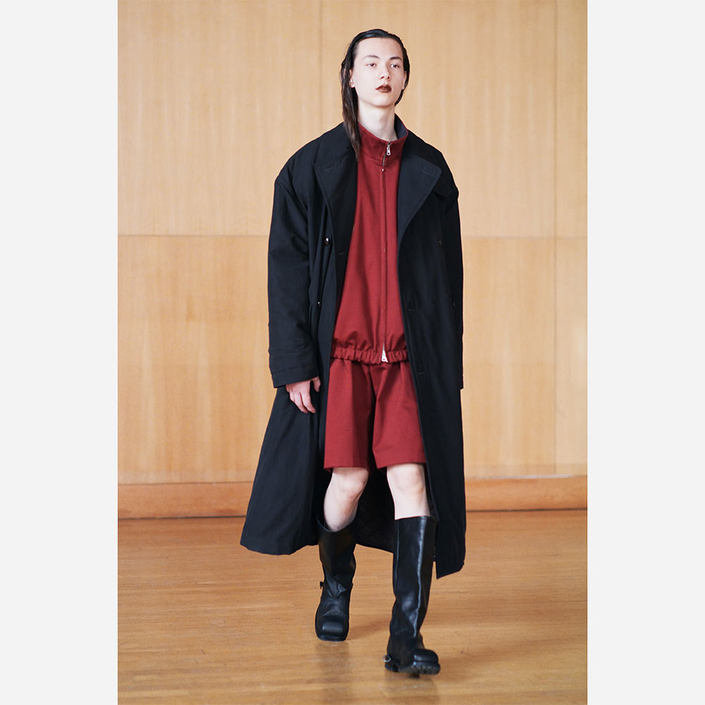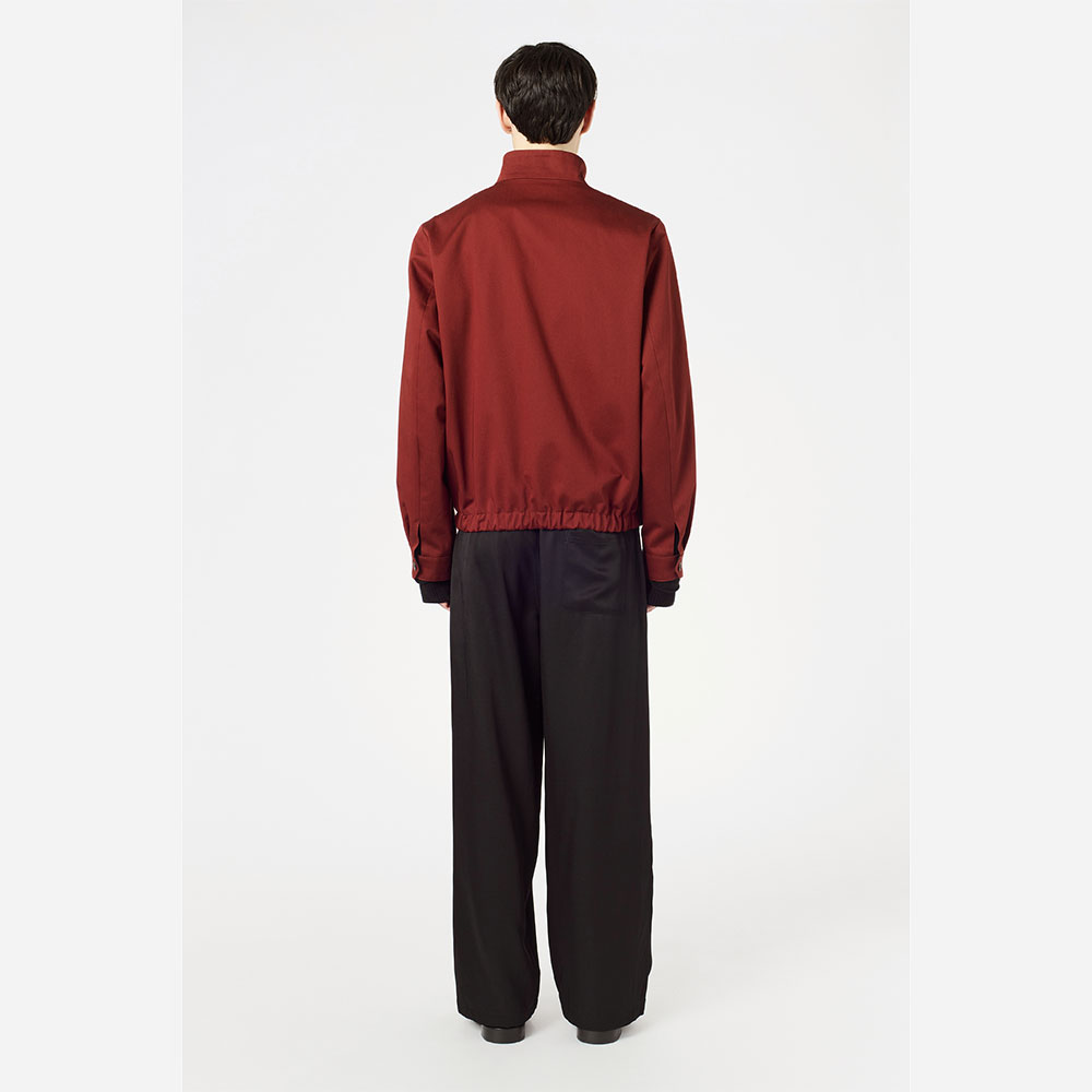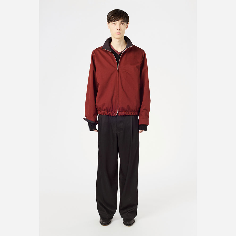 深紅のイタリア製ツイル生地(メガツイストツイル)を使用したフルジップジャケット。ショート丈のボックスシルエットに、ファネルネックカラー、ランポ製両面ジッパー、ホーンボタン付きカフス、コントラストカラーの内側裏地とネックライン、エラスティック裾を採用。ハリントンジャケットに着想を得たデザインは、日常の定番アイテムをオーバーサイズで解釈したアワーレガシー流。ヒップラインに落ち着くリラックスシルエットが特徴です。