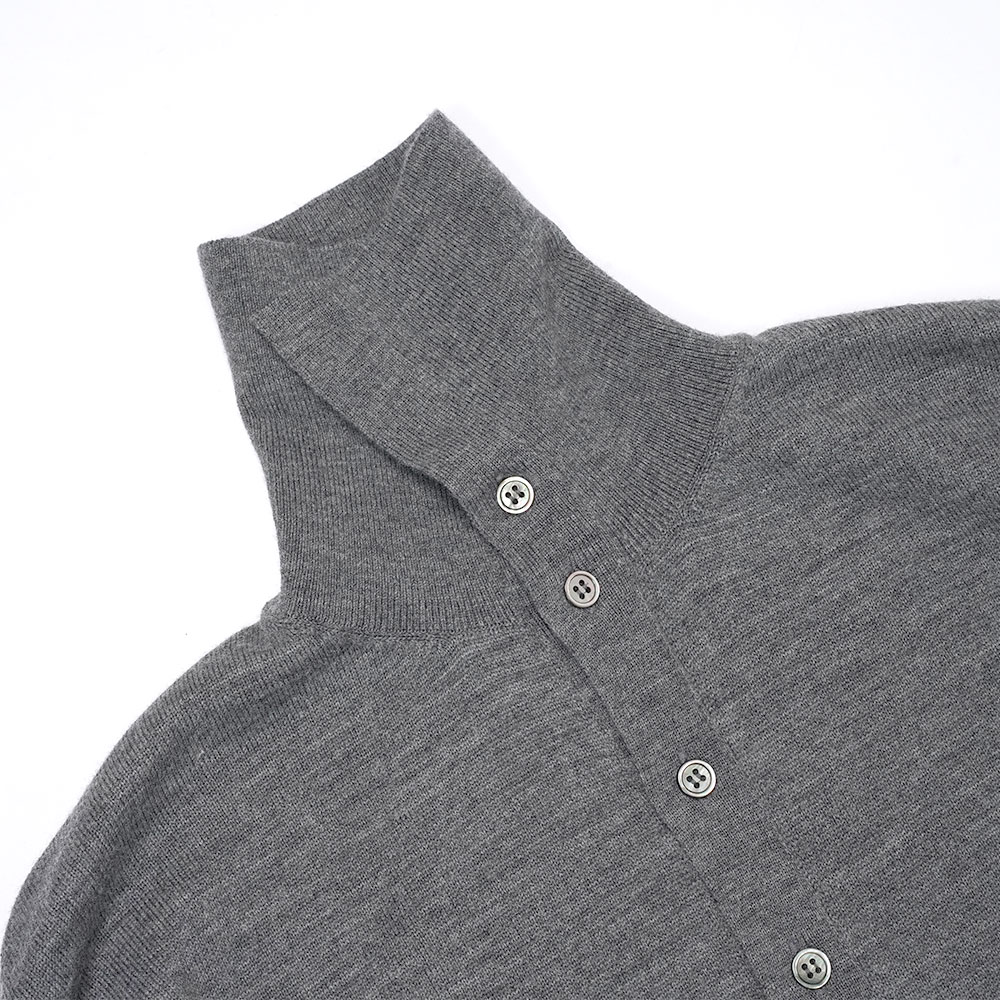 一着で様々な着こなしができる、襟付きのウールカーディガンです。シャツの上に羽織るも良し、一番上までボタンを留めればタートルネックとしてもお使いいただけます。