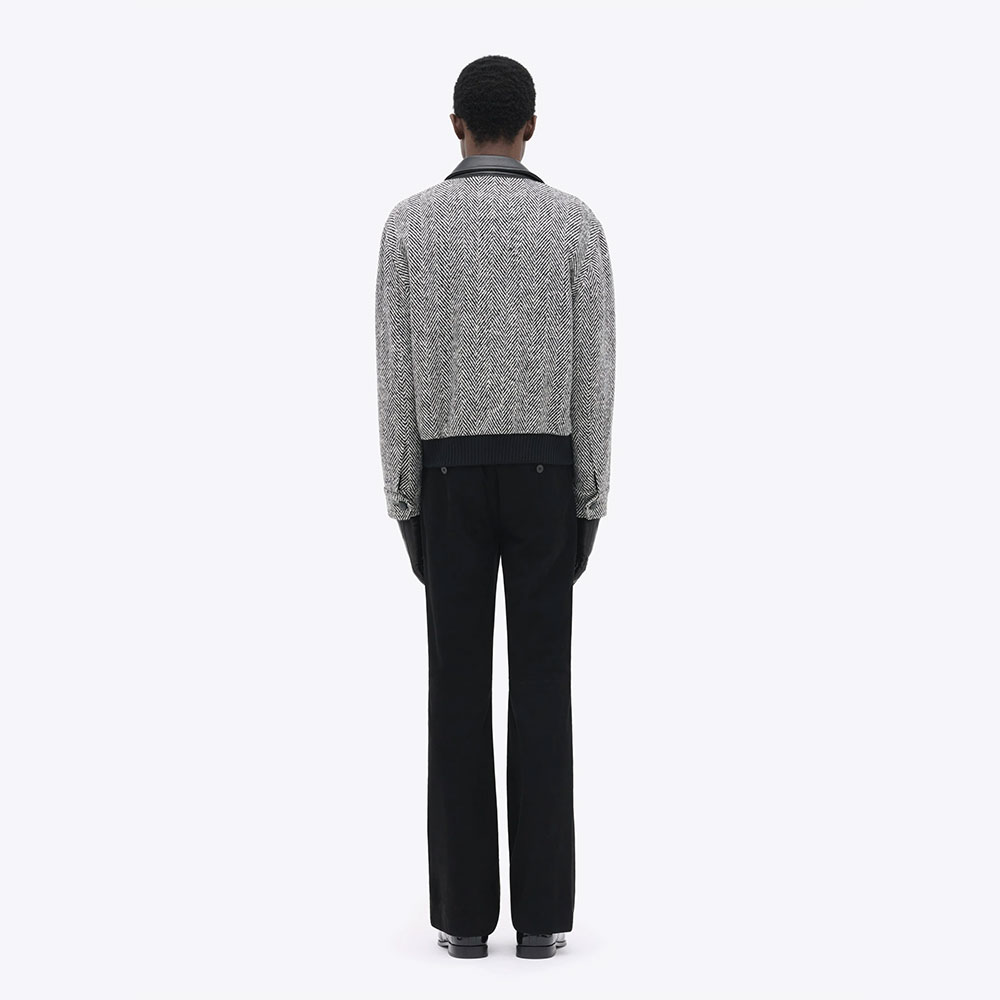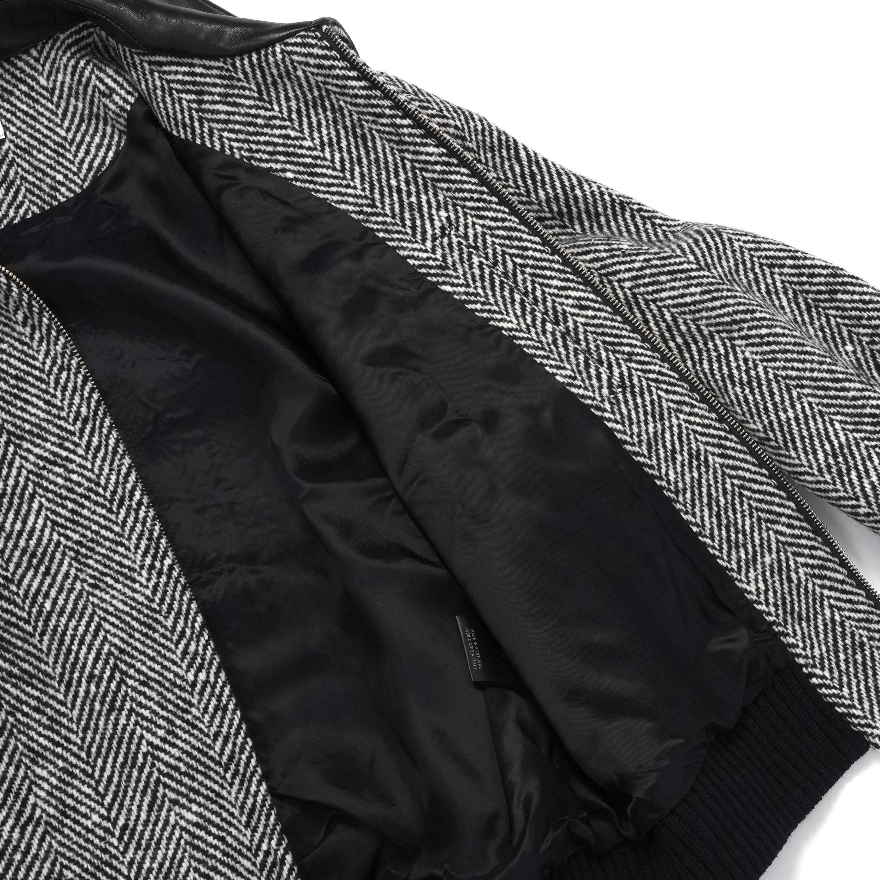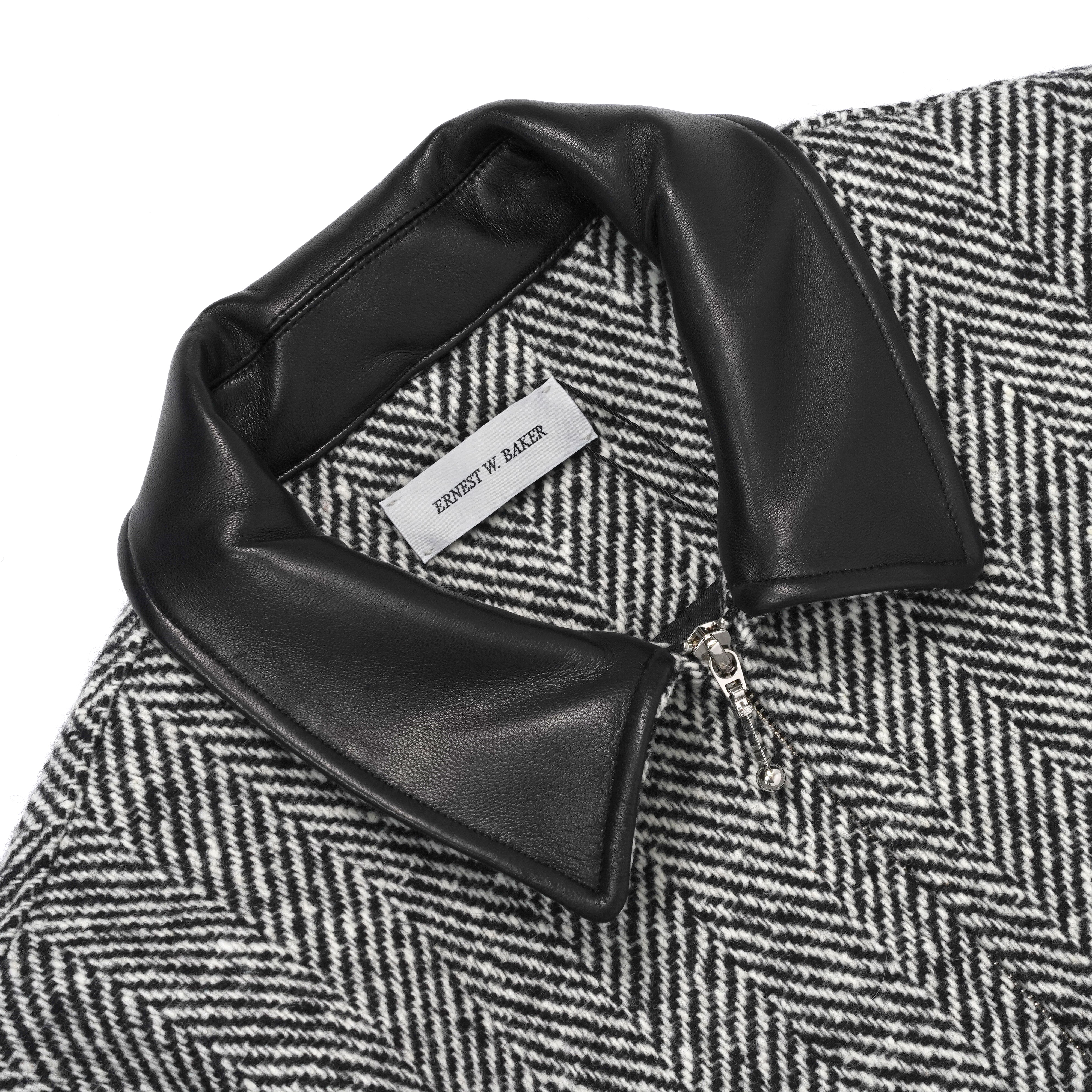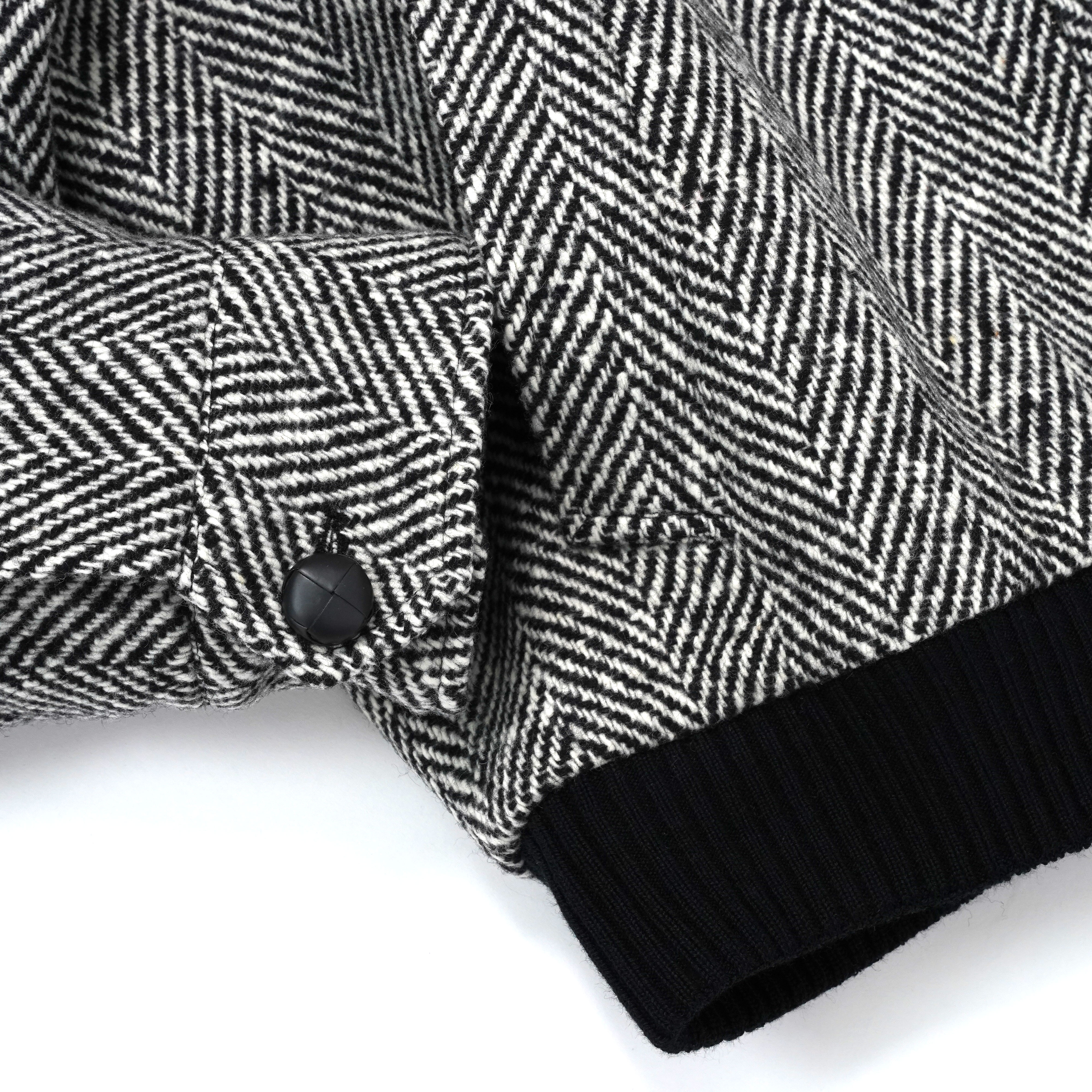 ブランド定番のハリントンジャケット。ブラック/ホワイトのヘリンボーン柄が上品な印象を与えるジャケット。首元にはレザー製のカラーをあしらい、クラシックな雰囲気にモダンなエッセンスを加えています。外側に2つのポケット、内側に1つのポケットを備え、実用性にも優れた一着。短丈、コンパクトなサイジング。