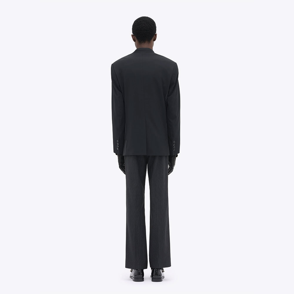 ブランドのスタイルの根幹をなすノーカラーテーラードジャケット。イタリア製のバージンウールツイルを使用。サテンのピークドラペルカラーのタキシード仕様。パッド入りショルダー。センターベント。サテン総裏地の内側にもウェルトポケット付き。