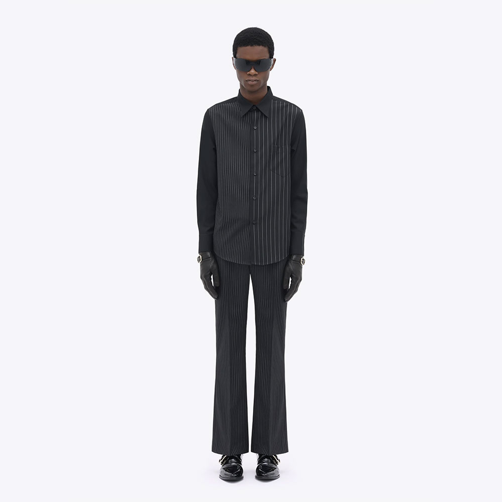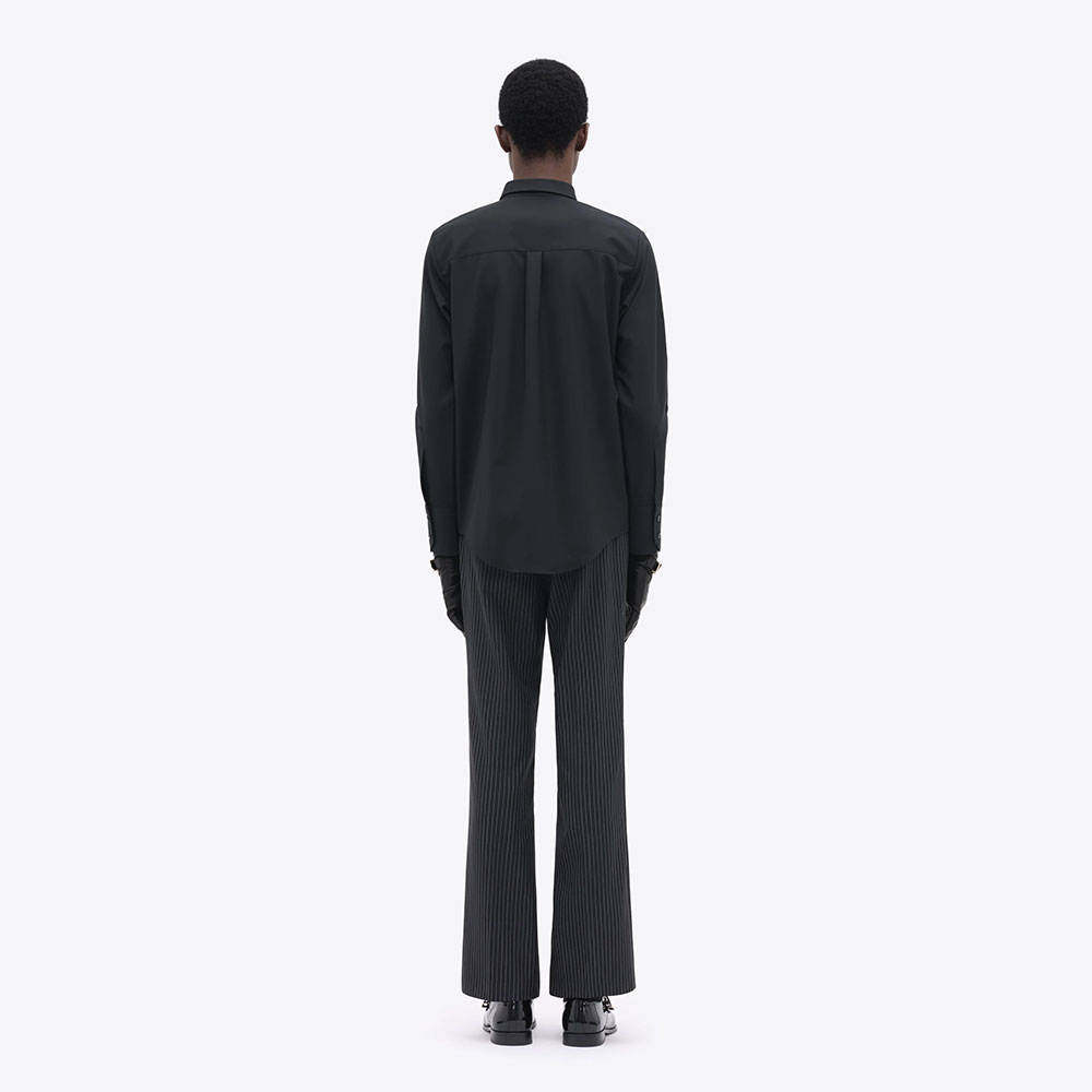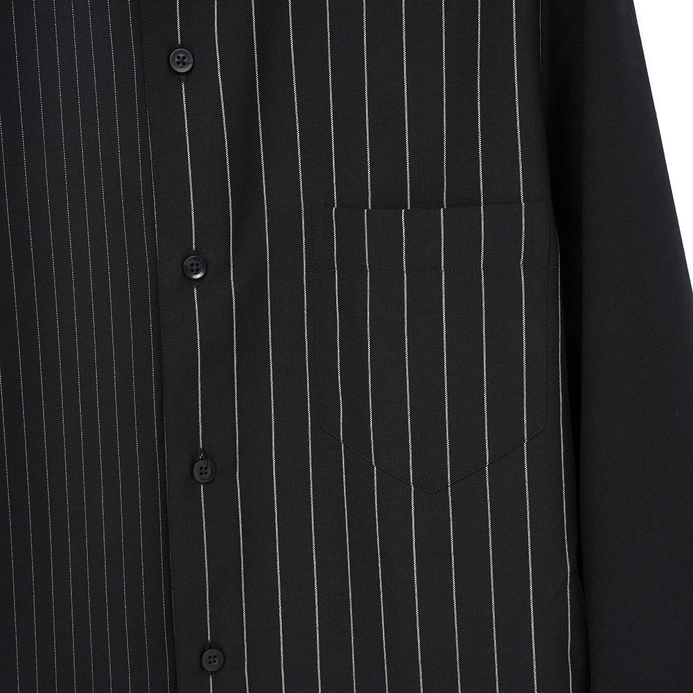 ブラック/ホワイトのピンストライプ柄シャツ。ウール99%、ポリエステル1%の生地を使用し柔らかく快適な着心地。クラシカルな印象の中に、さりげない遊び心を添えたデザイン。