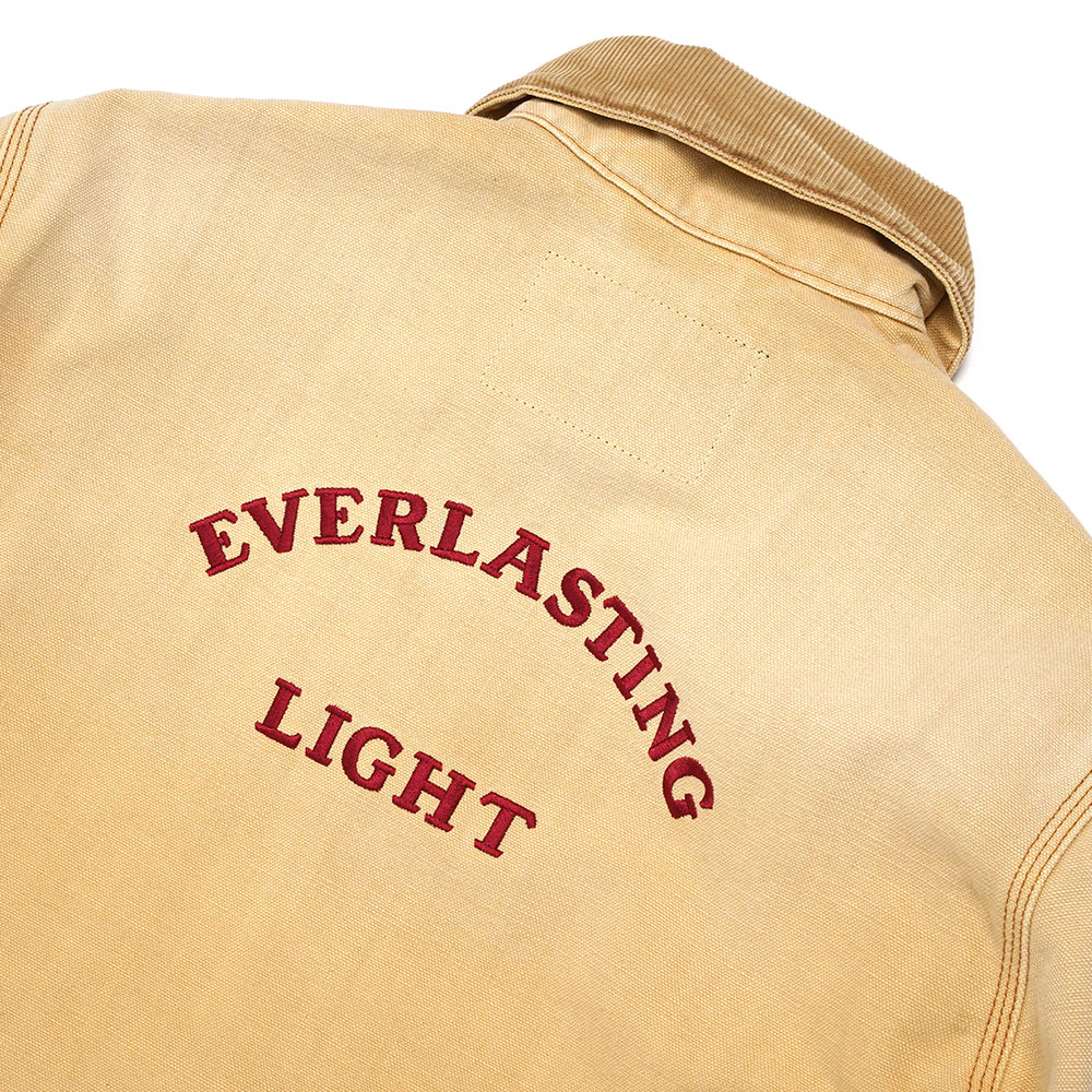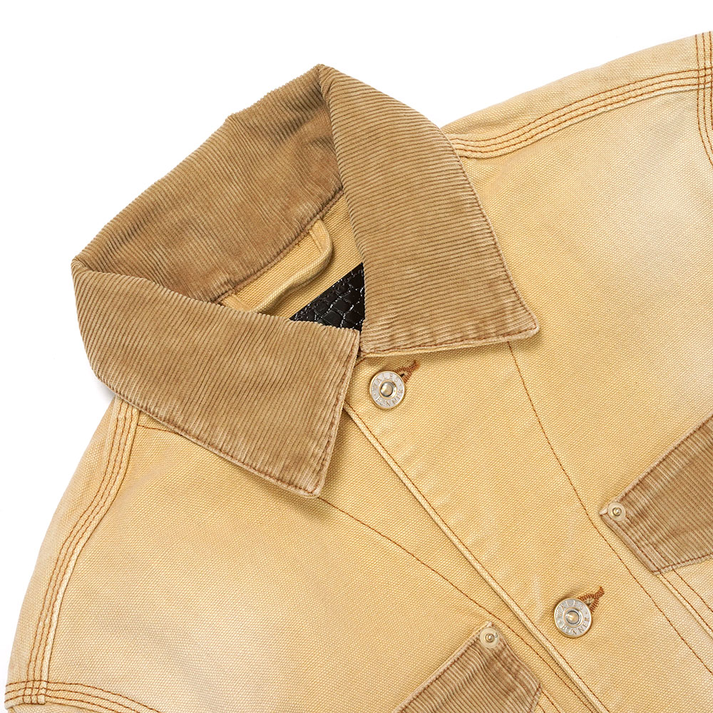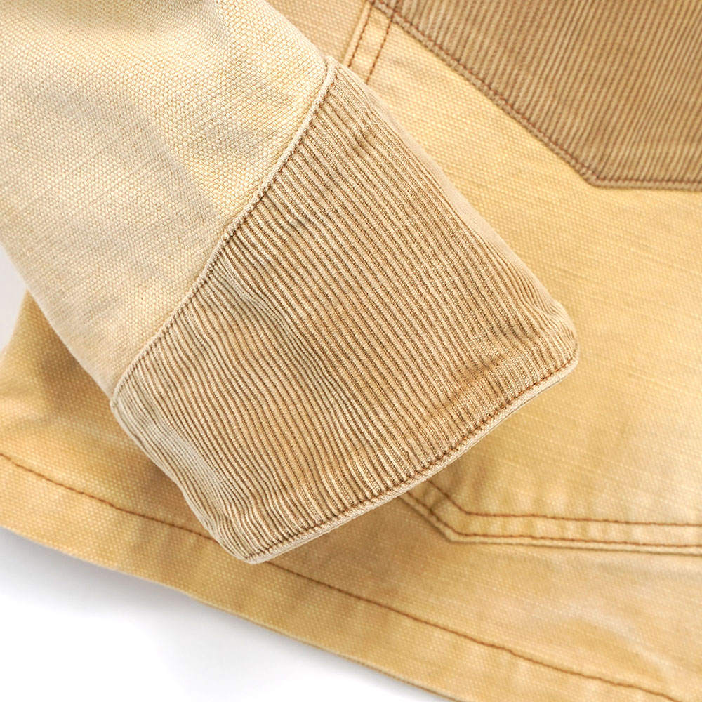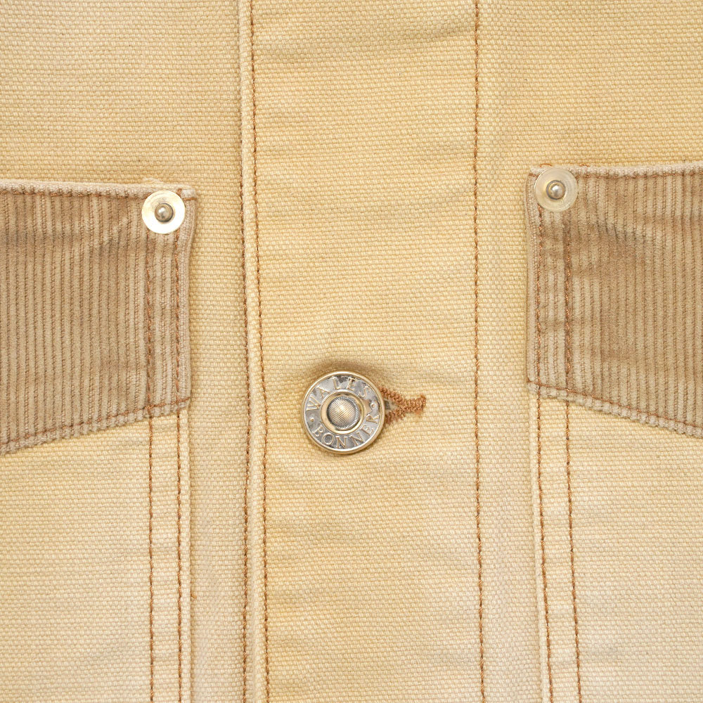 一点一点職人による手作業で加工されたキャンバス地ジャケット。コーデュロイのコントラストとダメージ加工のディテールが特徴。生地の職人技による性質上、一点一点が個体差があり、着用者の体型に合わせて徐々に形作られていきます。ややタイトフィット。