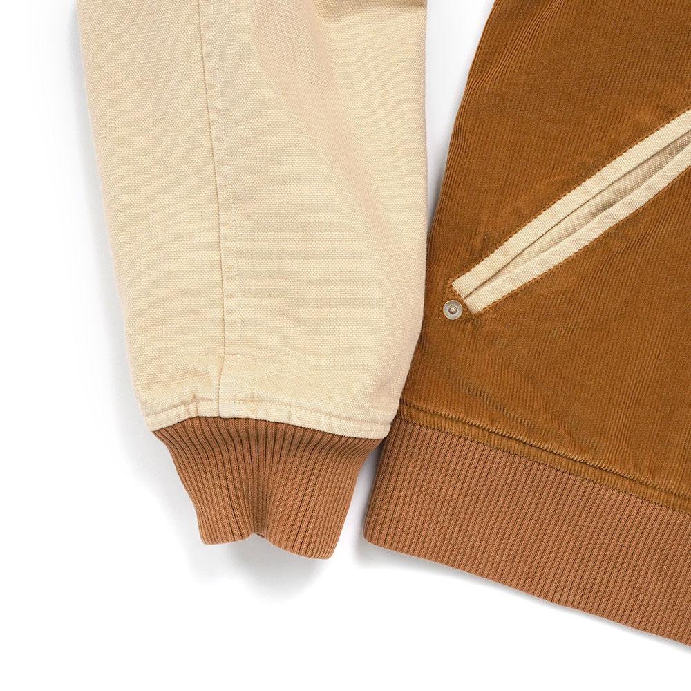 コーデュロイ生地の身頃と、キャンバス素材による切り返し袖が特徴的なバーシティジャケットになります。コンパクトなサイズ感。ドレッシーなスタイリングとも相性◎