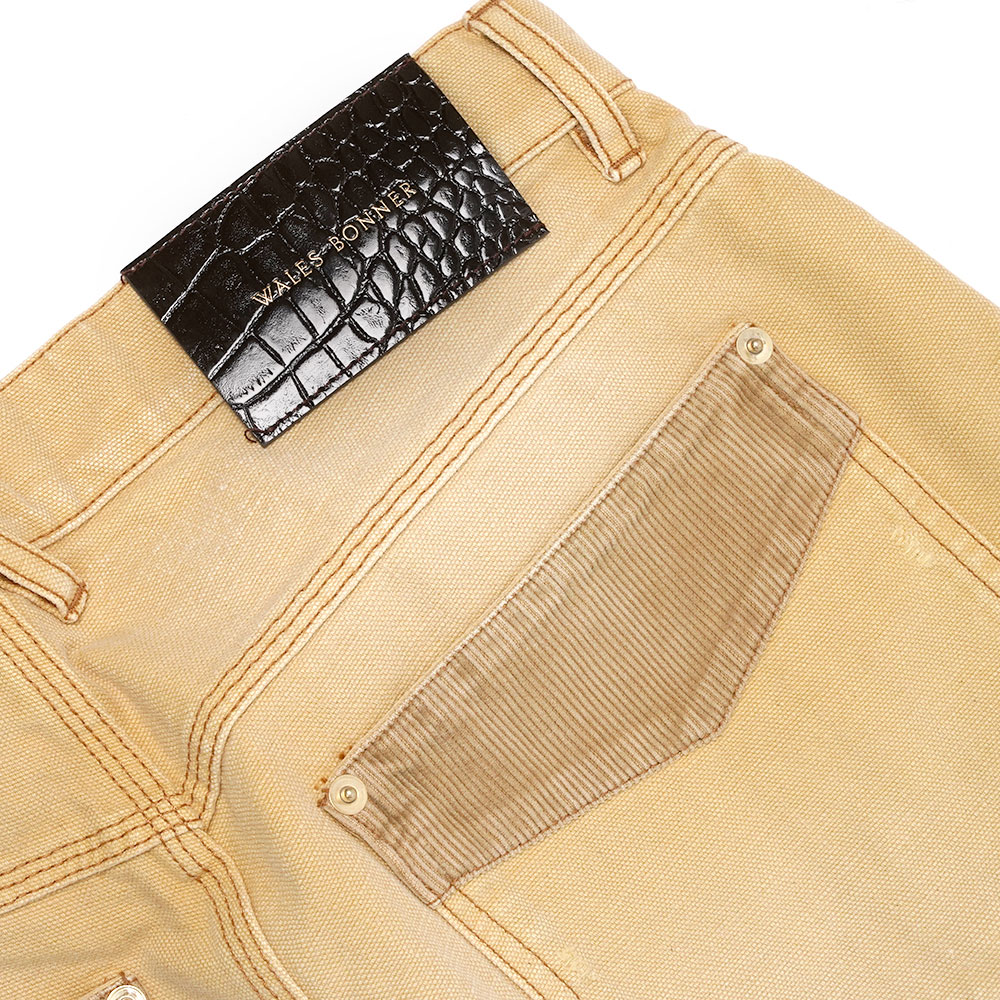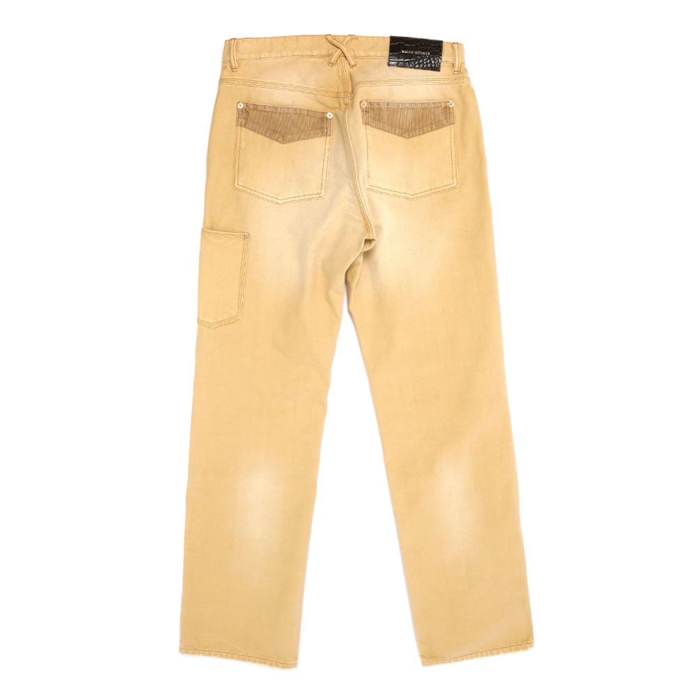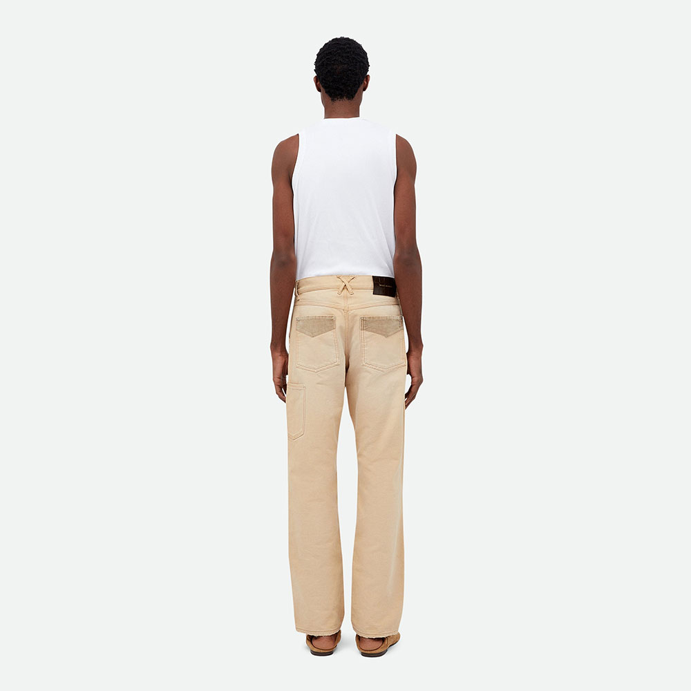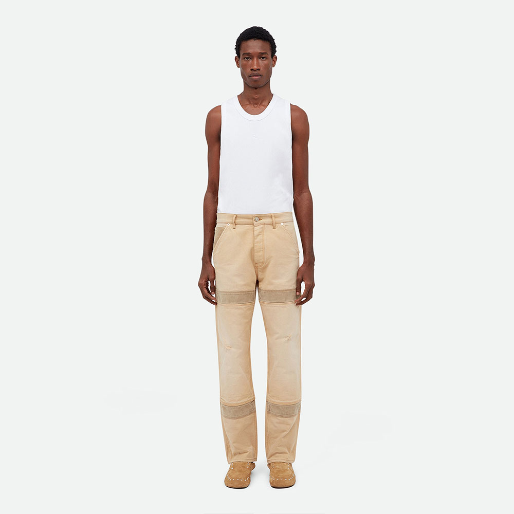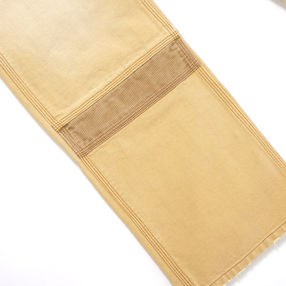 一点一点職人による手作業で加工されたキャンバス地パンツ。コーデュロイのコントラストとダメージ加工のディテールが特徴。 生地の職人技による性質上、一点一点が個体差があり、着用者の体型に合わせて徐々に形作られていきます。