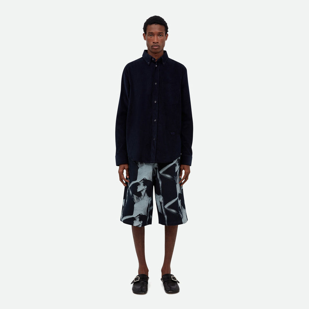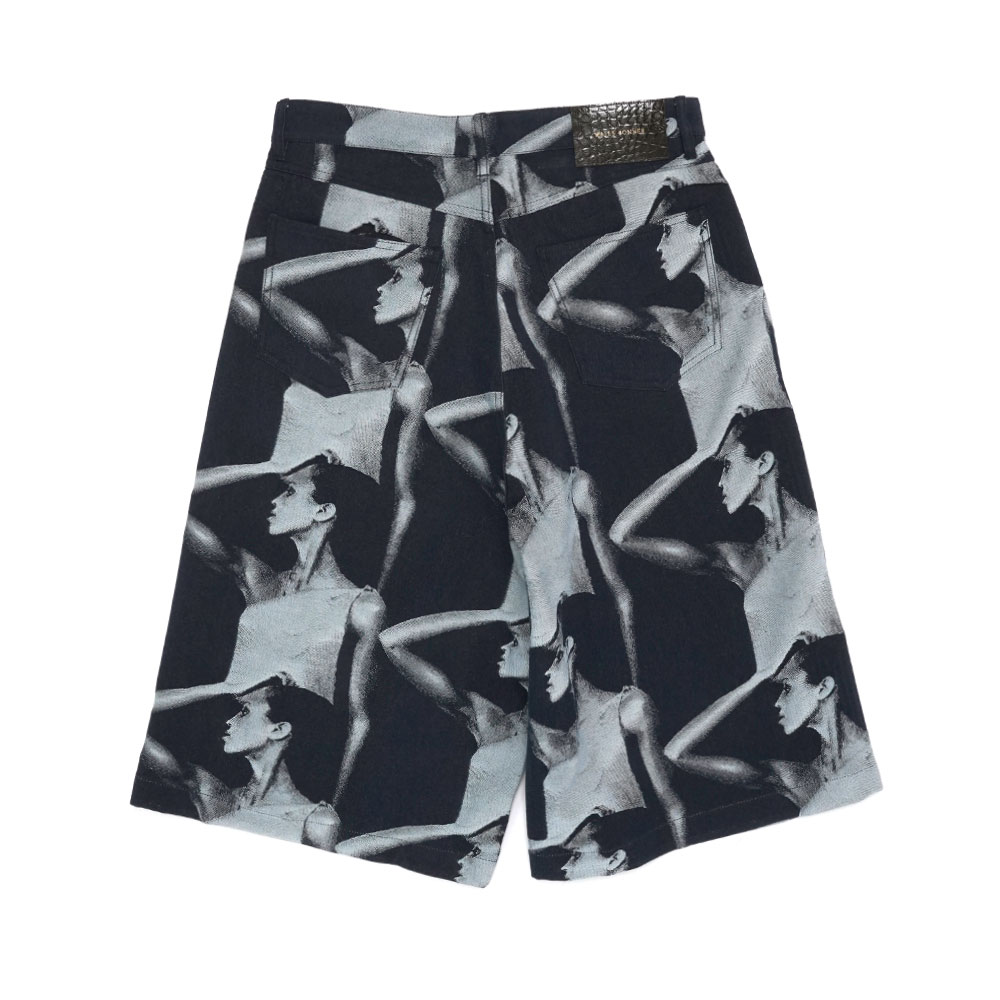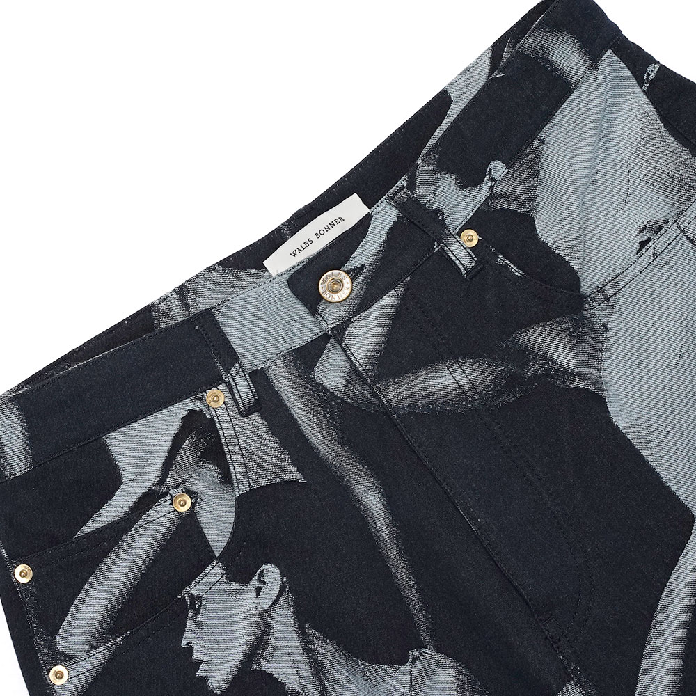 ストレートフィットデニムジャカードショーツ。生地に織り込まれたアーカイブ画像が特徴的。シカゴ・サウスサイドを拠点に、彫刻や陶芸を中心に、音楽・パフォーマンス・建築など多ジャンルで活動するアーティスト兼アクティヴィストのシアスター・ゲイツとアフリカ系アメリカ人の歴史・文化を記録した写真アーカイブを再評価・再構築するプロジェクト「ブラックイメージコーポレーション」のコラボレーションコレクション。