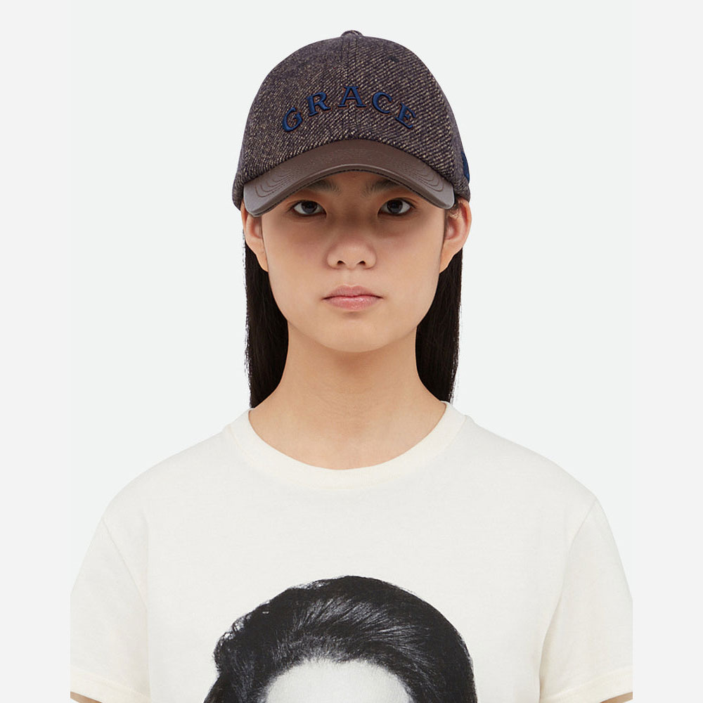 ウールメランジ生地を使用したクラシックなベースボールキャップ。コントラストの効いたレザーのつばと、前面および側面パネルに刺繍モチーフをあしらっています。小さめのサイズ感。