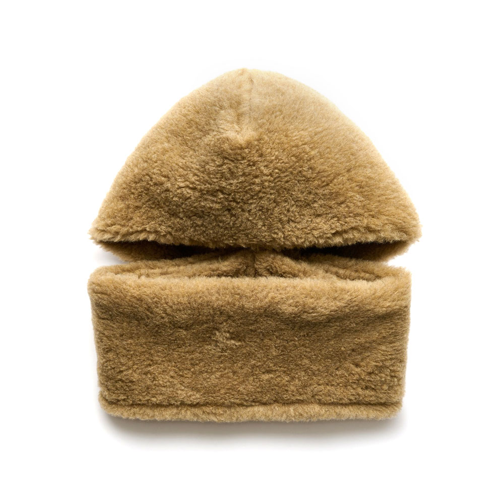 スペイン製フェイクシアーリング生地(ウール・アクリル・ポリエステル混紡)を使用した存在感のあるスヌード。ィット感のある帽子デザインに、顔の一部を覆えるネックスヌードが一体成型されています。頭部はぴったりフィットし、首周りはゆったりとしたシルエットです。