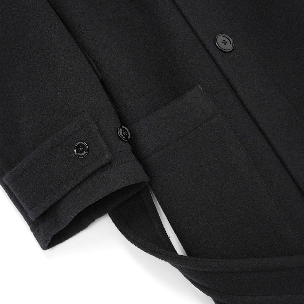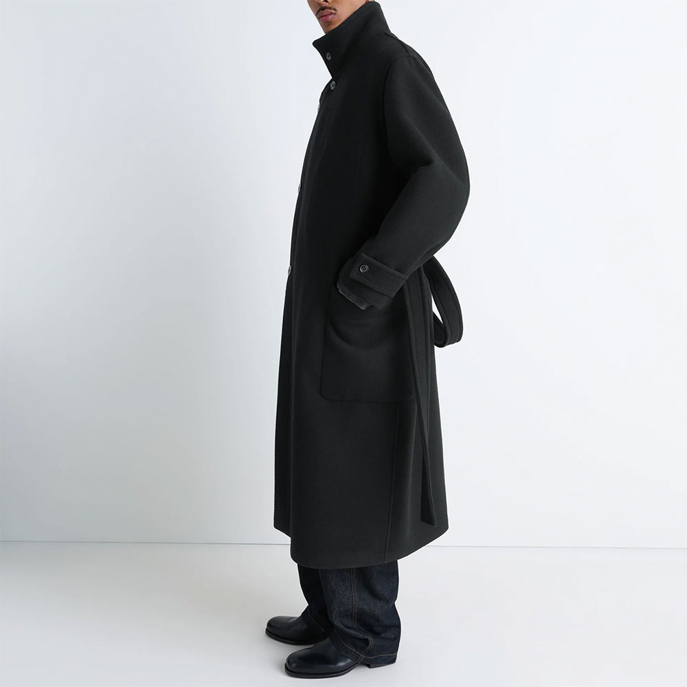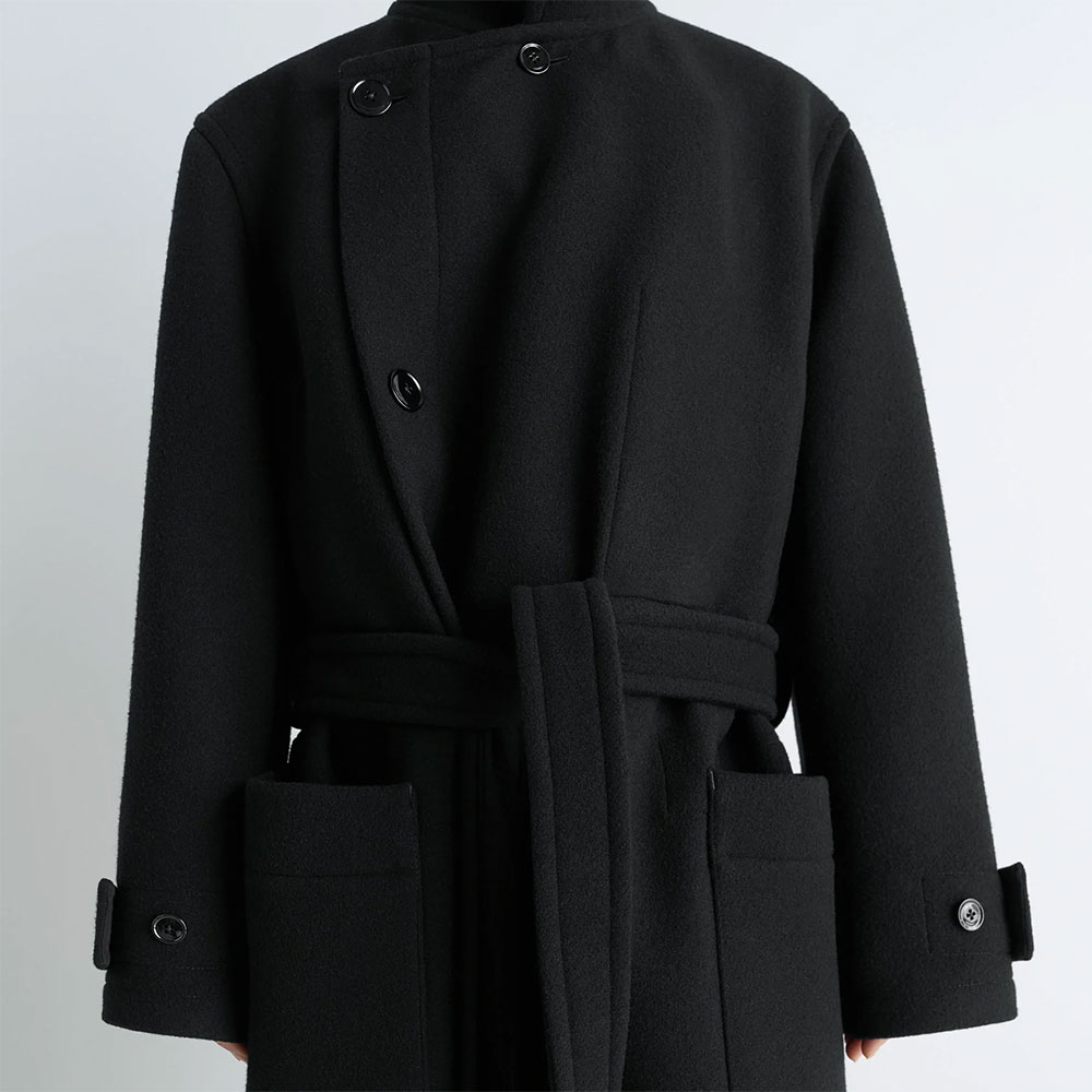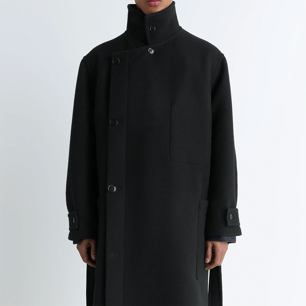 柔らかく防寒性も高い両面ウール。ルメールらしいシングルボタンで閉じられるハイカラー、アシンメトリーなボタンフロント。シルエットに丸みを与えたドロップショルダーのオーバーサイズフィット。内側に胸ポケット、パッチポケット2つ、取り外し可能なベルト付き。