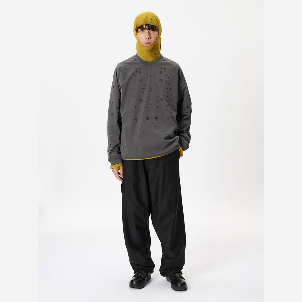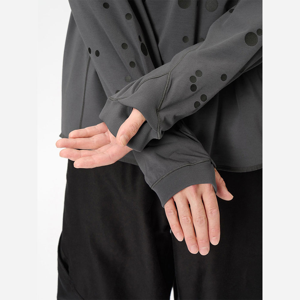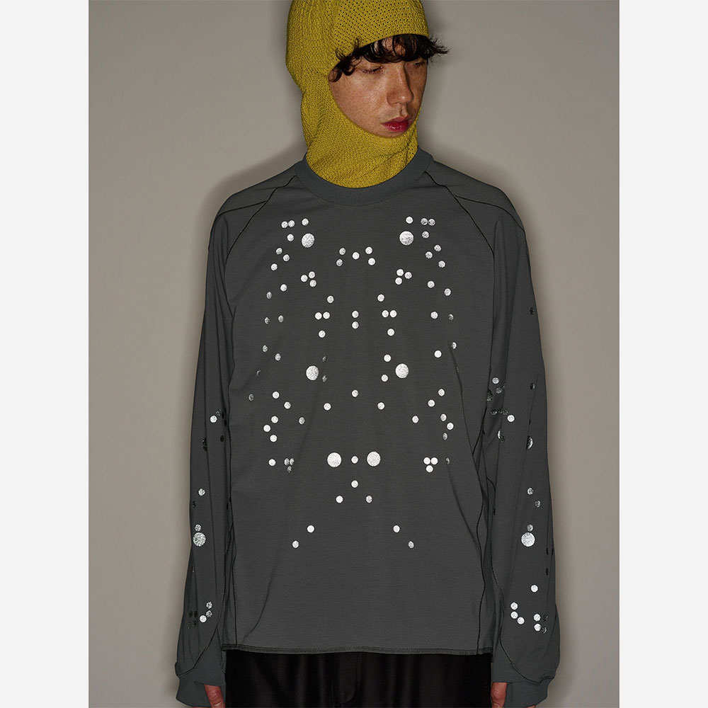 モーションキャプチャーの人体マッピングから着想を得た、再帰反射ドットプリントのTシャツ。生地はイージーケアでハリのあるポリエステル 100%の素材を使用。滑らかな肌触りで生地にはドレープ感があり、柔らかな印象のシルエットを描きます。