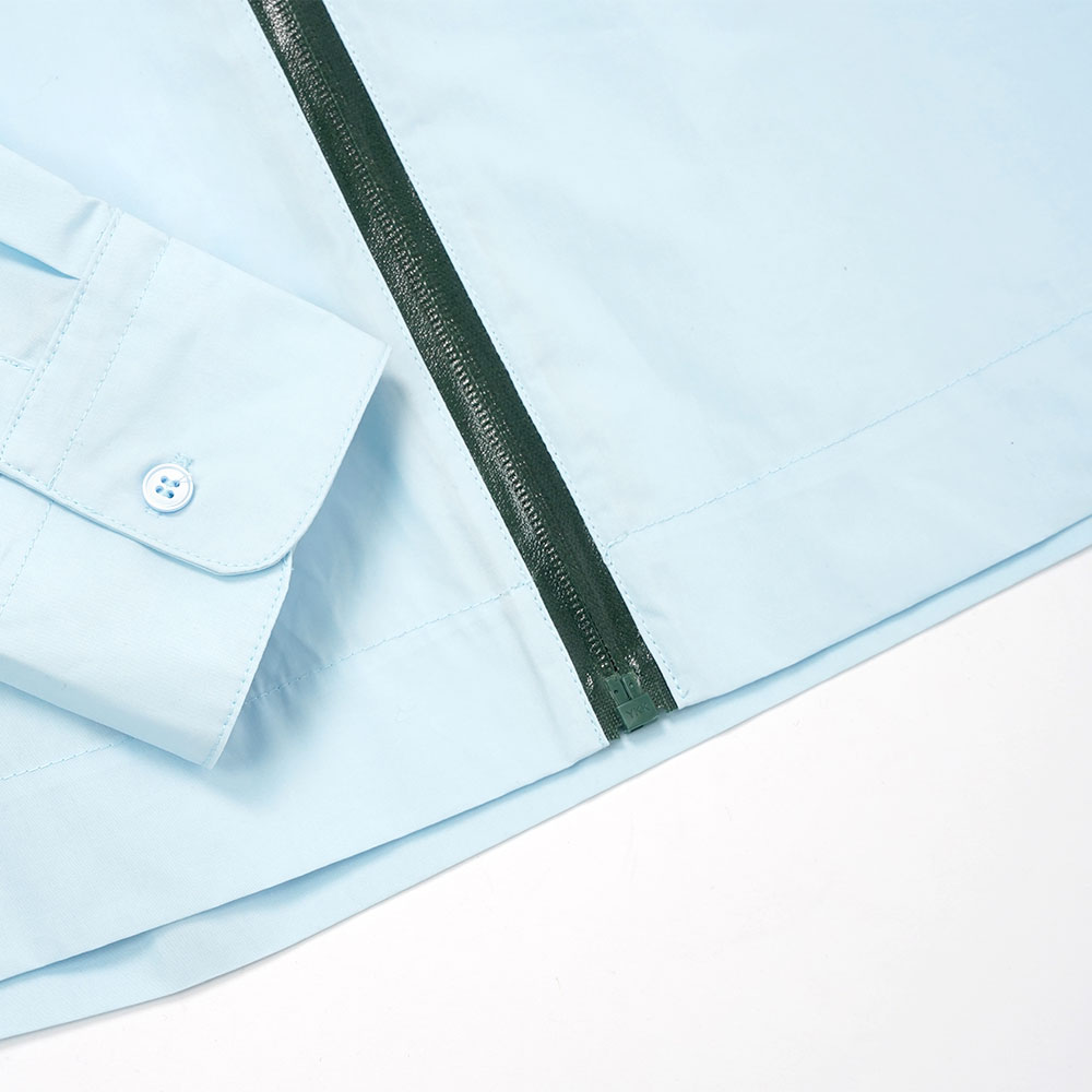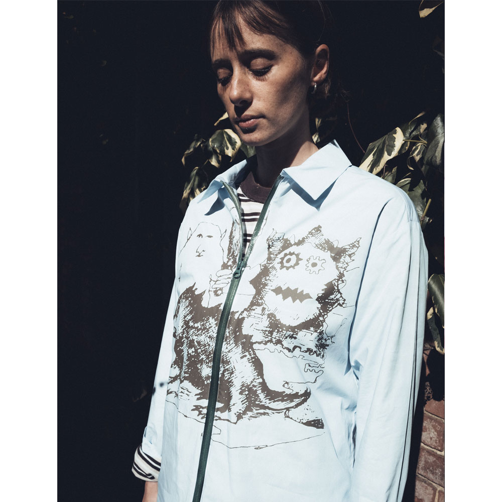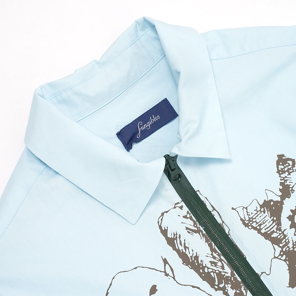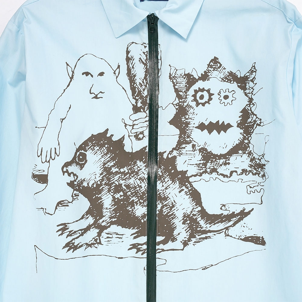 フロントに施された大胆なプリントが特徴的なジップシャツになります。着丈はやや短めのボックスシルエット。シャツジャケットに近い感覚で着用できます。