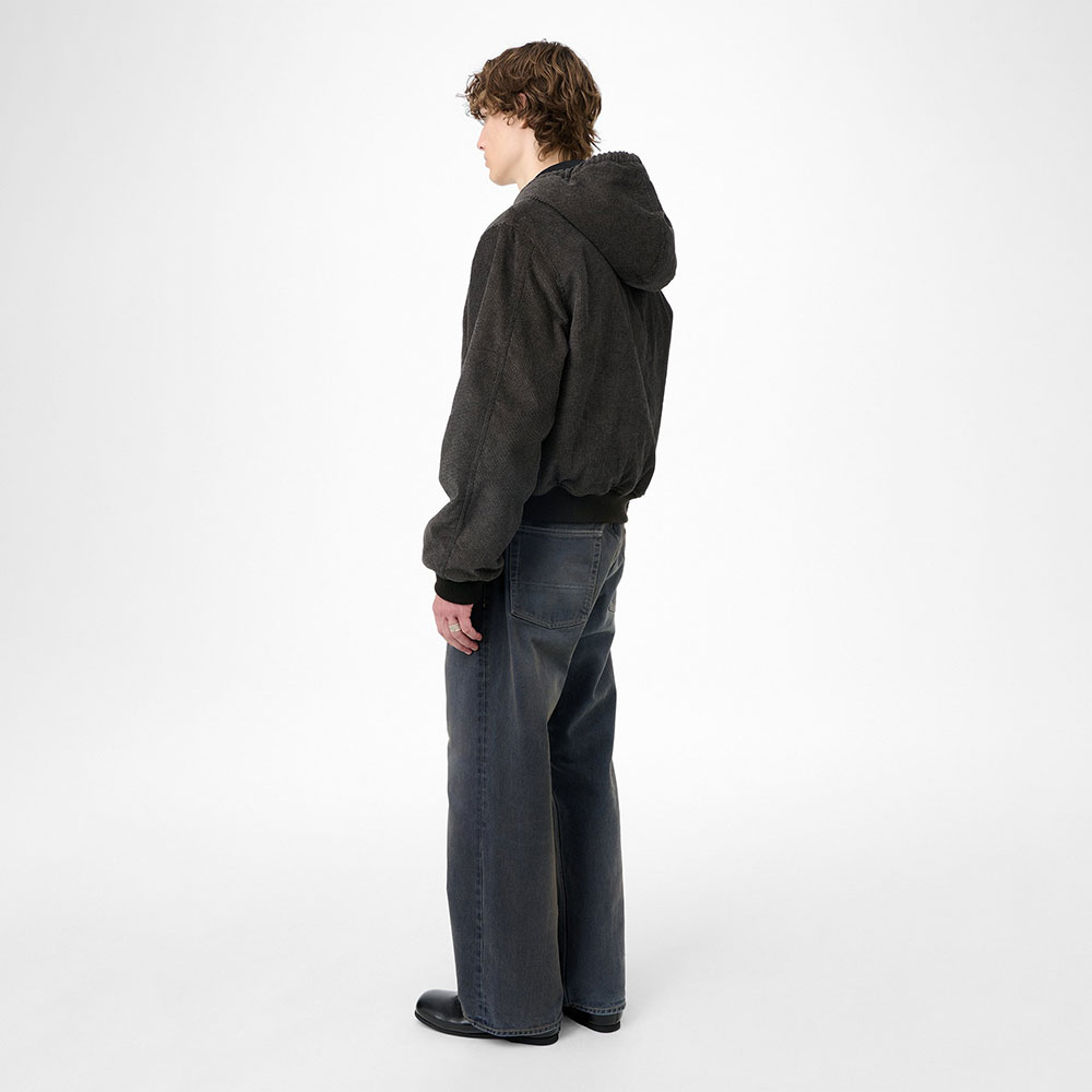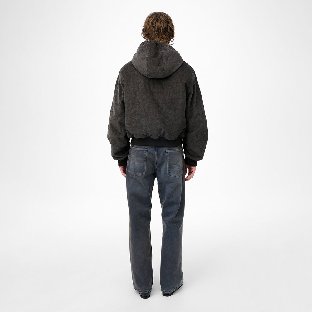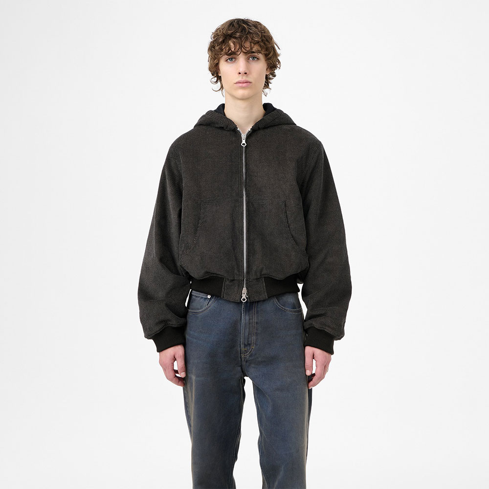 ダークブラウンのツイルコーデュロイを使用したフード付きジャケット。中国産コットンツイルコーデュロイ生地使用。ゆったりとしたボックスシルエットが特徴。伸縮性のあるフード、ダメージ加工を施したランポ製両面ジッパー、ポーチポケット、リブ編みの袖口と裾を備えています。