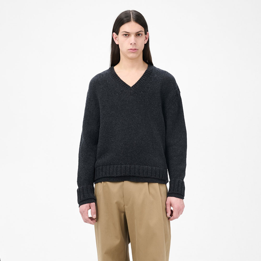 チャコール色のローツイストメリノを使用したVネックニット。イタリア産エクストラファインメリノウールを使用。ゆったりとしたオーバーサイズフィットが特徴。ジャージー編み、リブ編みのVネックカラー、ドロップショルダー、リブ編みの袖口と裾に追加のレイヤーを施しています。袖口から続く一体成型のリブが、重ね着したような錯覚を生み出し、下に着ている下着との調和を演出します。