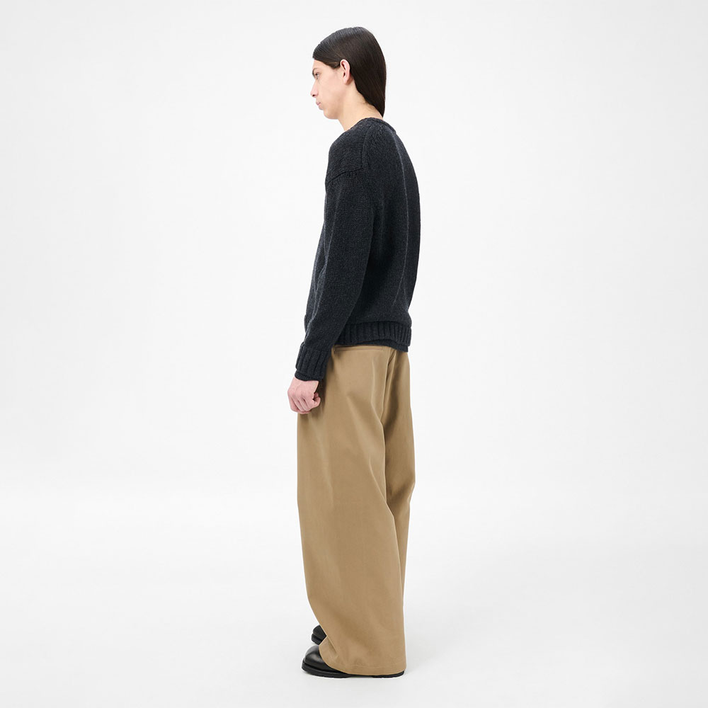 本品は厳選された糸を使用して製造されています。糸の自然な特性と編み構造により、着用時に衣服が伸びる特性があります。着用者の体型に合わせて形が整い、時間の経過とともに自然な風合いが加わり、デザインプロセスが完成します。衣服の品質を保つため、折りたたんで保管してください。