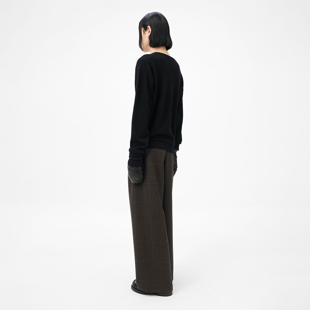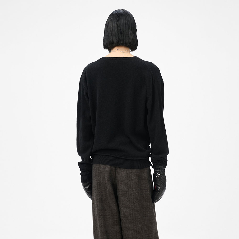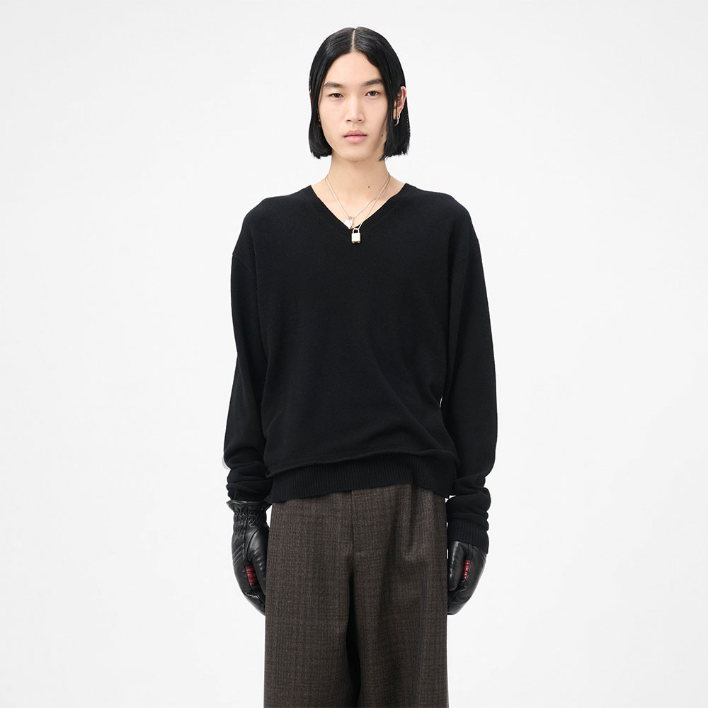 ブラック・ケルブウール製Vネックセーター。カシミアに匹敵する品質のイタリアンメリノウールを使用。ドロップショルダーのリラックスフィット。ソフトなジャージー編み構造、リブ編みのVネックカラー、トップステッチ仕上げの裾と袖口にロールエッジを施し、ラフな風合いを演出。