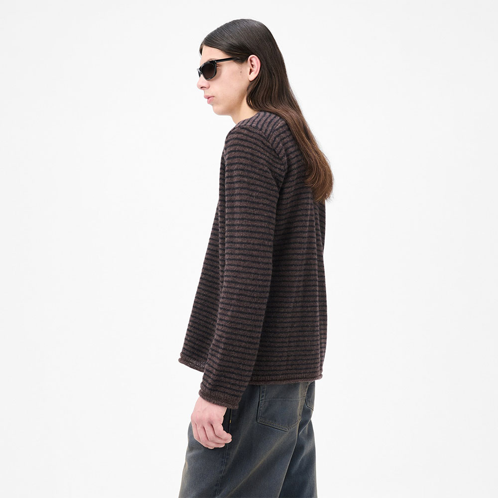 アルパカ、RWSウール、再生ポリアミド、ポリアミドを組み合わせたイタリア製糸を使用し、ストライプ柄のジャージーニットで仕立てたクルーネックセーター。特徴は、ロールエッジ付きのファッションネックライン、フレンチショルダー、サイドシームの逆縫いディテール、ロールカフスとロールヘムです。