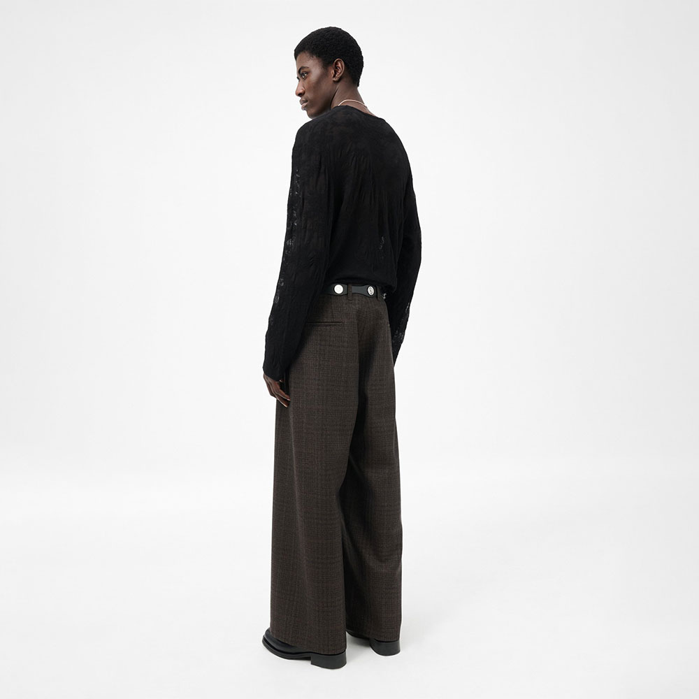 イタリア製バージンウール生地を使用したBRIDGE CHINOは、ワイドレッグのリラックスフィット。ダブルプリーツフロント、ボタン留め、YKKジップフライ、フロントウェルトポケット2つ、バックウェルトポケット2つ、シルエットを整えるダーツ仕様。ポンテショーツと同じ型紙を基に設計され、サイドシームレス構造でクリーンなシルエットを実現。