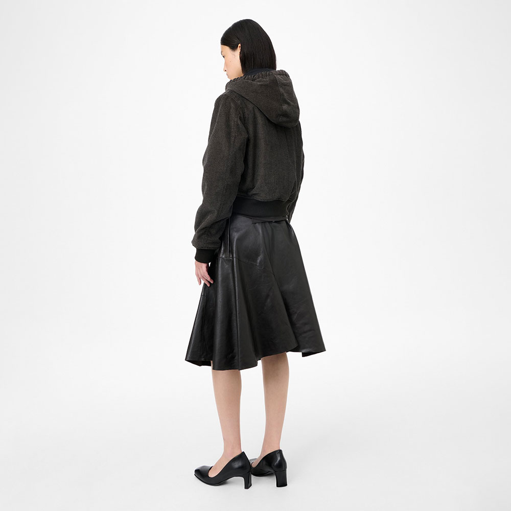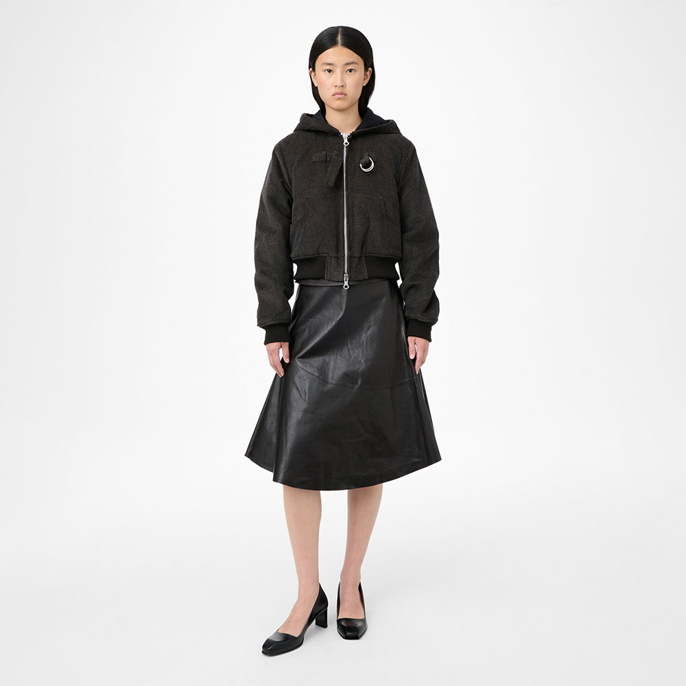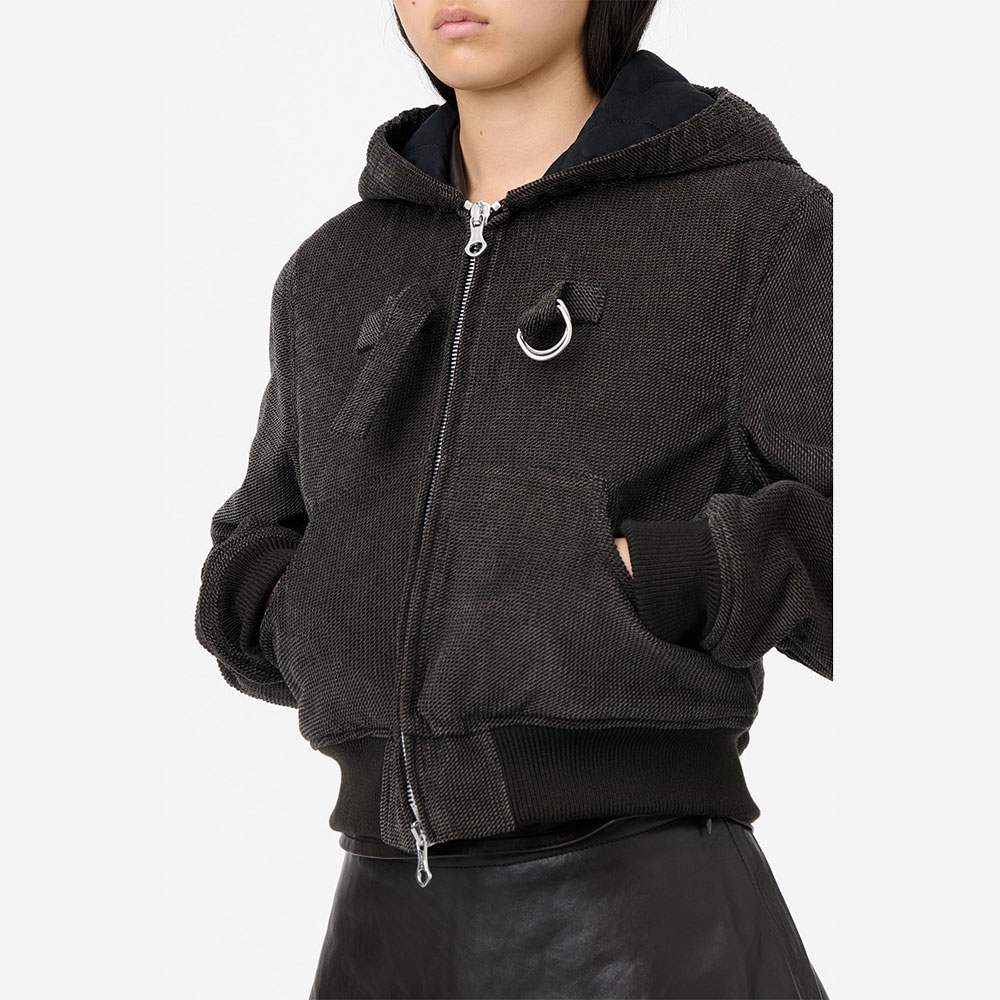 ダークブラウンのツイルコーデュロイを使用した「コーストジャケット」。中国産コットンツイルコーデュロイ生地で作られたこのレディースジャケットは、クロップド丈のボックスシルエットが特徴。伸縮性フード、ランポ製両面ジッパー、Dリングバックルストラップ、キルティング裏地、ポーチポケット、リブ編みの袖口と裾を備えています。
