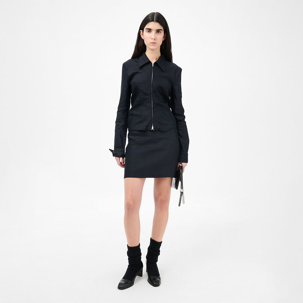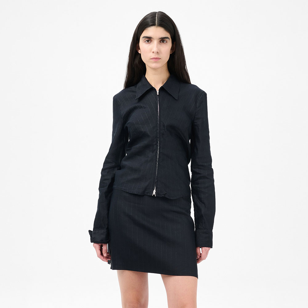 ピンストライプのスリムジップシャツ。イタリア製生地を使用し、ビスコース、リネン、エラスタン、ポリエステルの混紡素材で作られたレディーススリムジップシャツは、レギュラーでスリムなフィット感。特徴として、ランポ製ジッパー、シルエットを整えるダーツ仕様、ボタン付きカフス、サイドシームなし、カーブドヘムを採用しています。