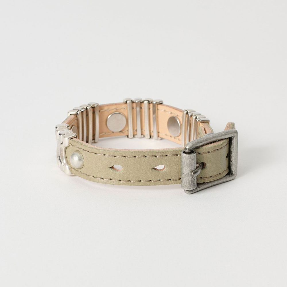 イタリア製カーフスキンレザーを使用したリベットディテールが特徴的なレザーブレスレット。調節可能なリストストラップに連なる金属製の波形装飾、金属ピンバックル留め具。