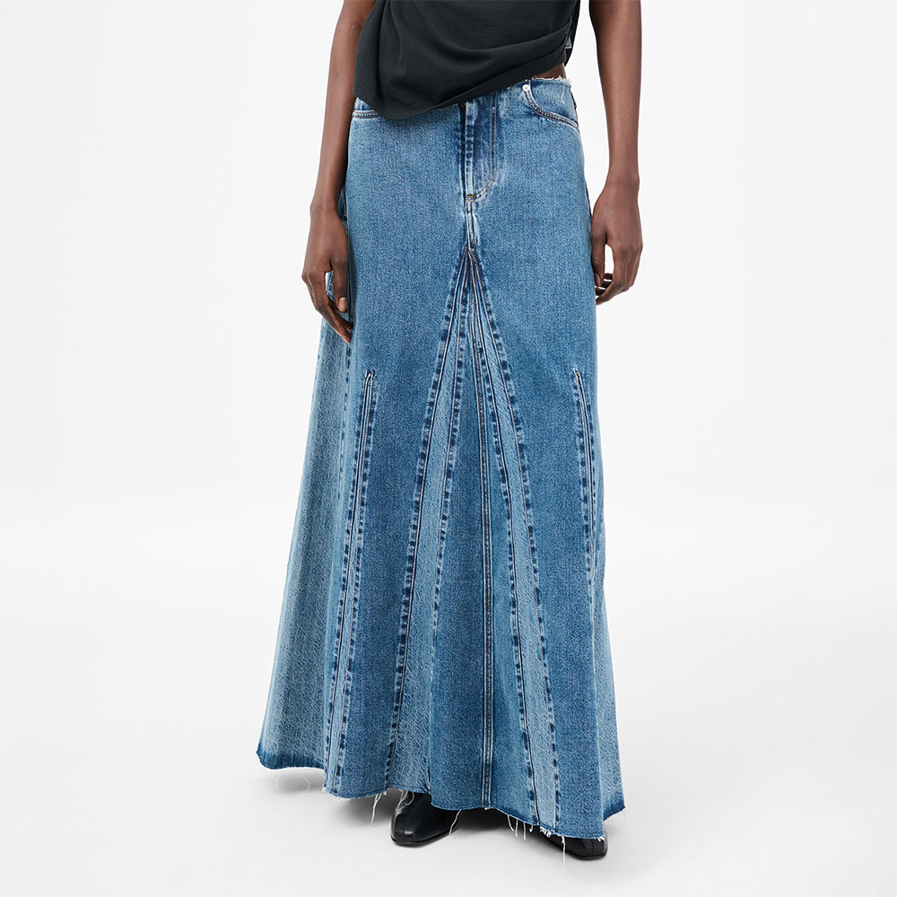 日本のデニム生地を使用したロングスカートになります。ゆったりとしたAラインシルエットが特徴。インディゴ染め、ヴィンテージ加工、手作業によるダメージ加工、パネル構造、フロントポケット2つ、生縁のウエストバンドと裾、フック&アイ留め、ジップフライを採用。ブロークンツイルデニムは、伝統的な斜めラインを断ち切ることで不規則なジグザグ構造を形成し、クラシックなツイル織りを再解釈。この特徴的なパターンは美観を高めるだけでなく、標準デニムにありがちなねじれを軽減する機能性も備えています。