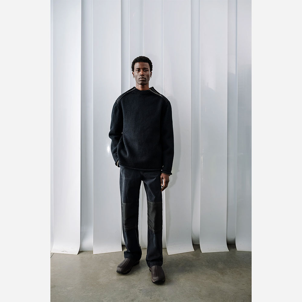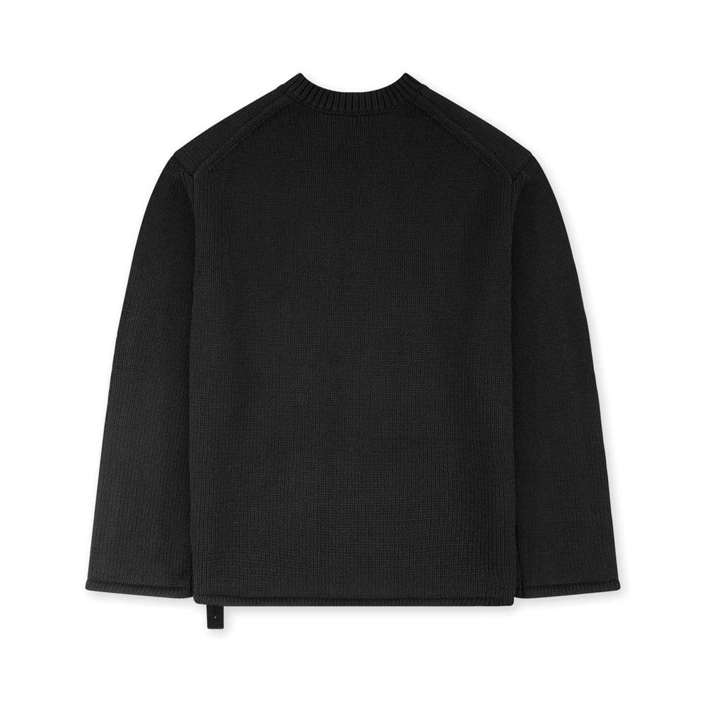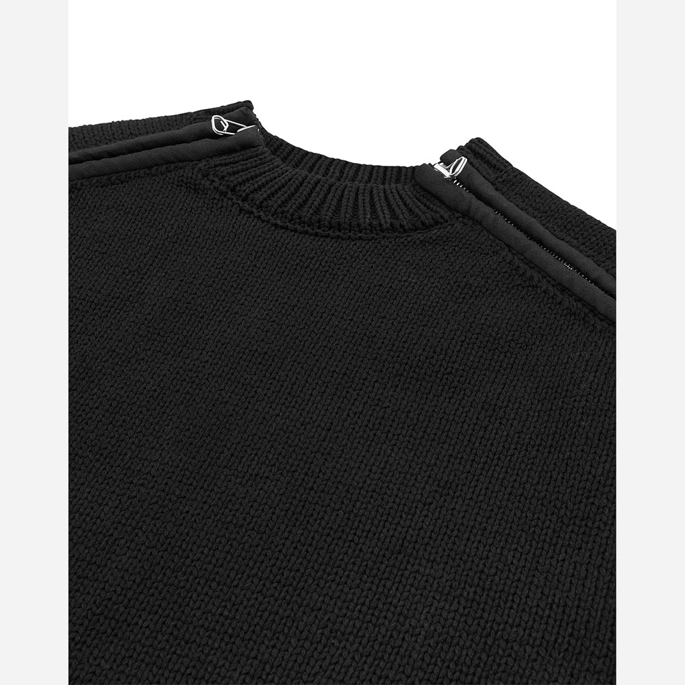 ミッドウェイトのコットンブレンドニットを使用した、ロングスリーブのプルオーバー。厚みのあるしっかりとした生地で、重厚感のある着心地を実現しています。ショルダー部分にはジップディテールをあしらい、クルーネックデザインにさりげないアクセントをプラス。リブ仕様の袖口と裾がシルエットを引き締め、ミニマルなブラックの質感が上品な印象を演出。ユーティリタリーテイストをほんのり効かせた、幅広いスタイリングに対応する一枚です。