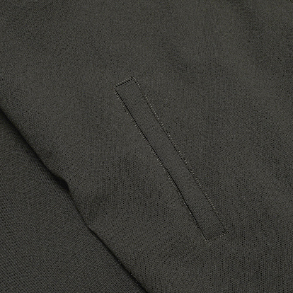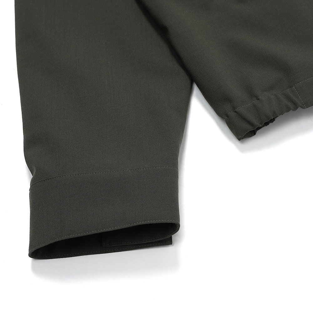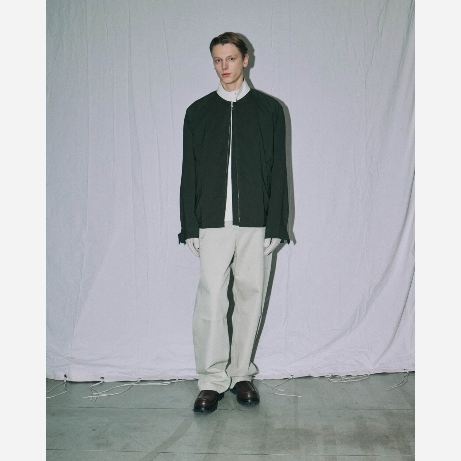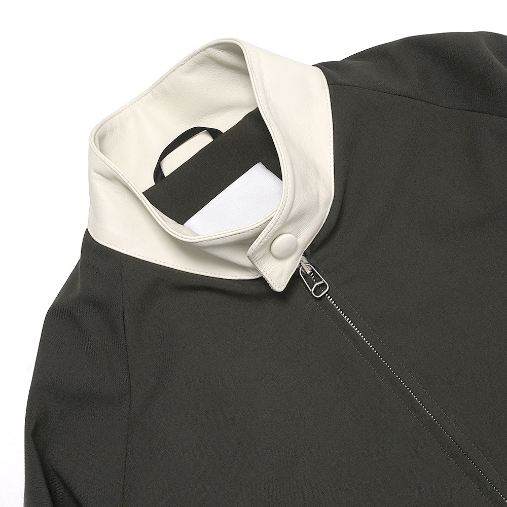 深みのあるダークグリーンに落ち着いたホワイトの襟元が映える、スイングトップ型ブルゾン。襟部分にはレザーを使用し、品のある佇まいに。内ポケット2つ、サイドポケット2つ。ダブルジップ仕様。