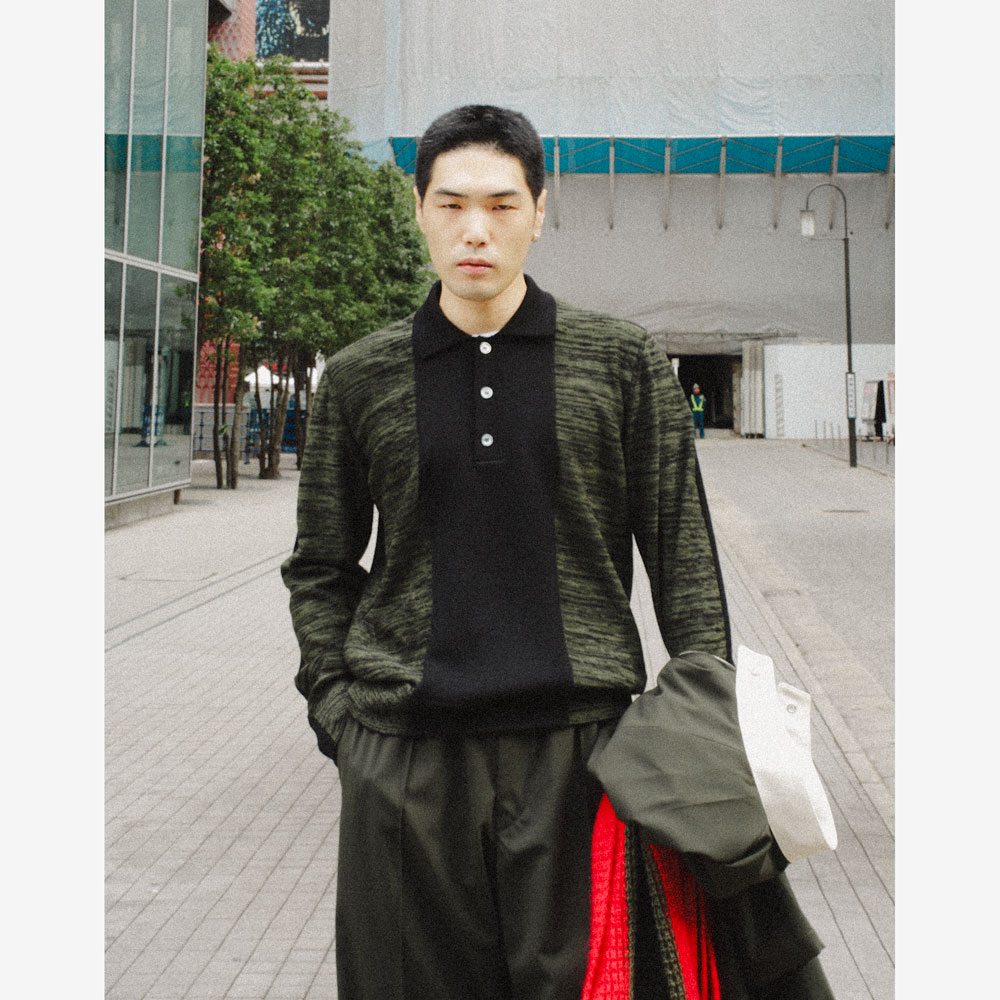 メランジカラーをベースに、直線的なブラックの切り替えデザインが映えるポロニット。袖口と裾はリブ仕様で、ブランドロゴ入りのボタンがアクセントに。