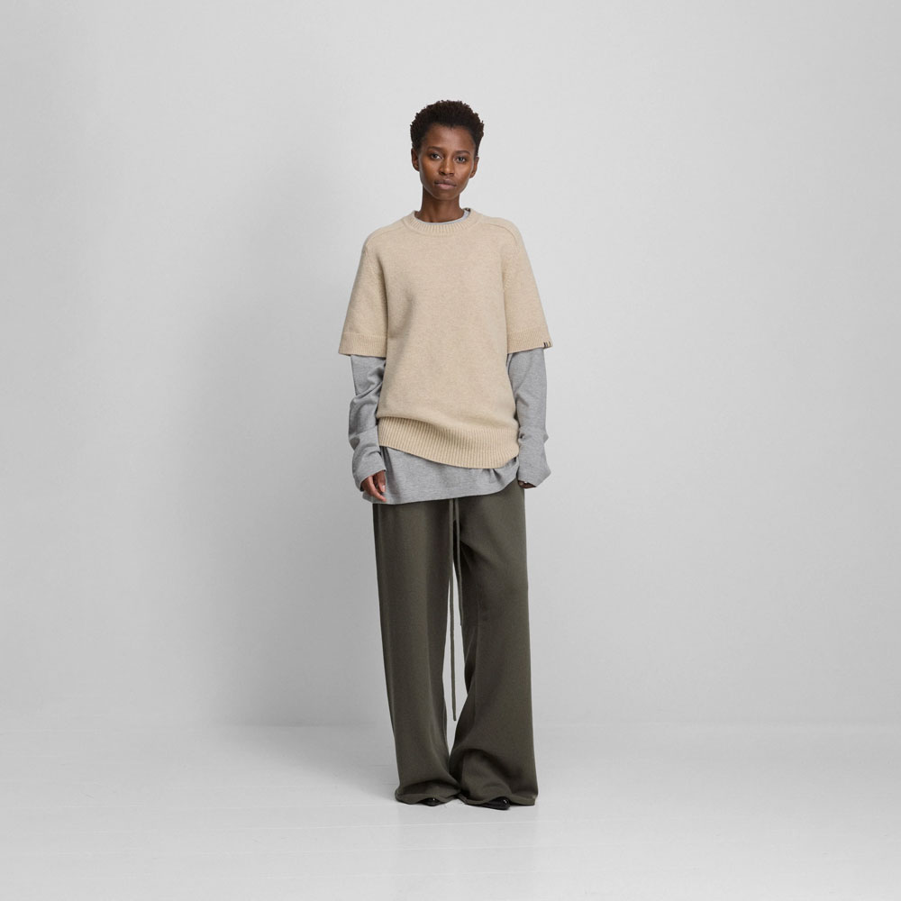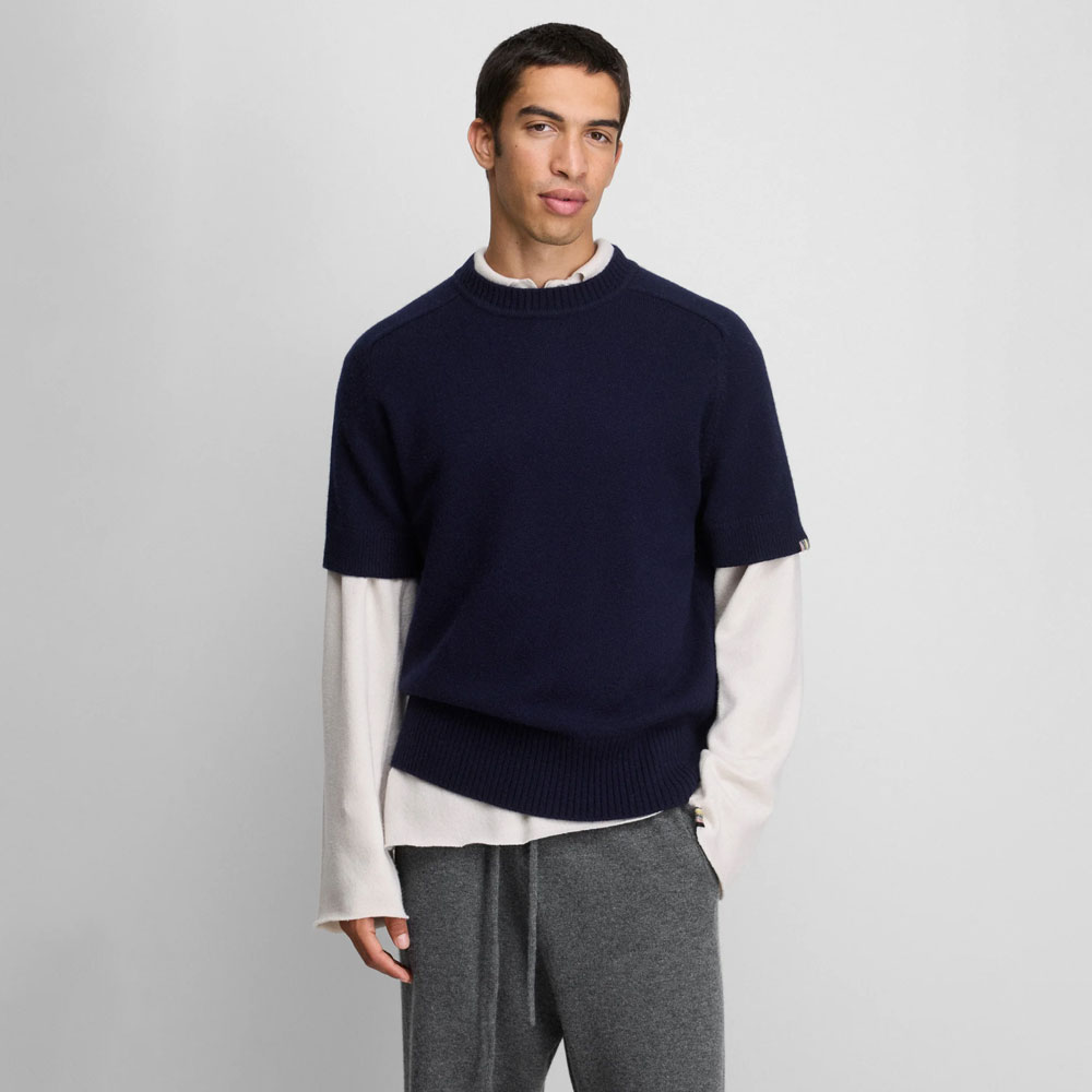 ネックライン、袖口、裾のリブデザインが効いたショートスリーブニット。ミディアムウェイトのカシミアを使用。ラグランスリーブで、ほどよくゆとりのあるストレートシルエット。レイヤードのスタイリングにも最適。