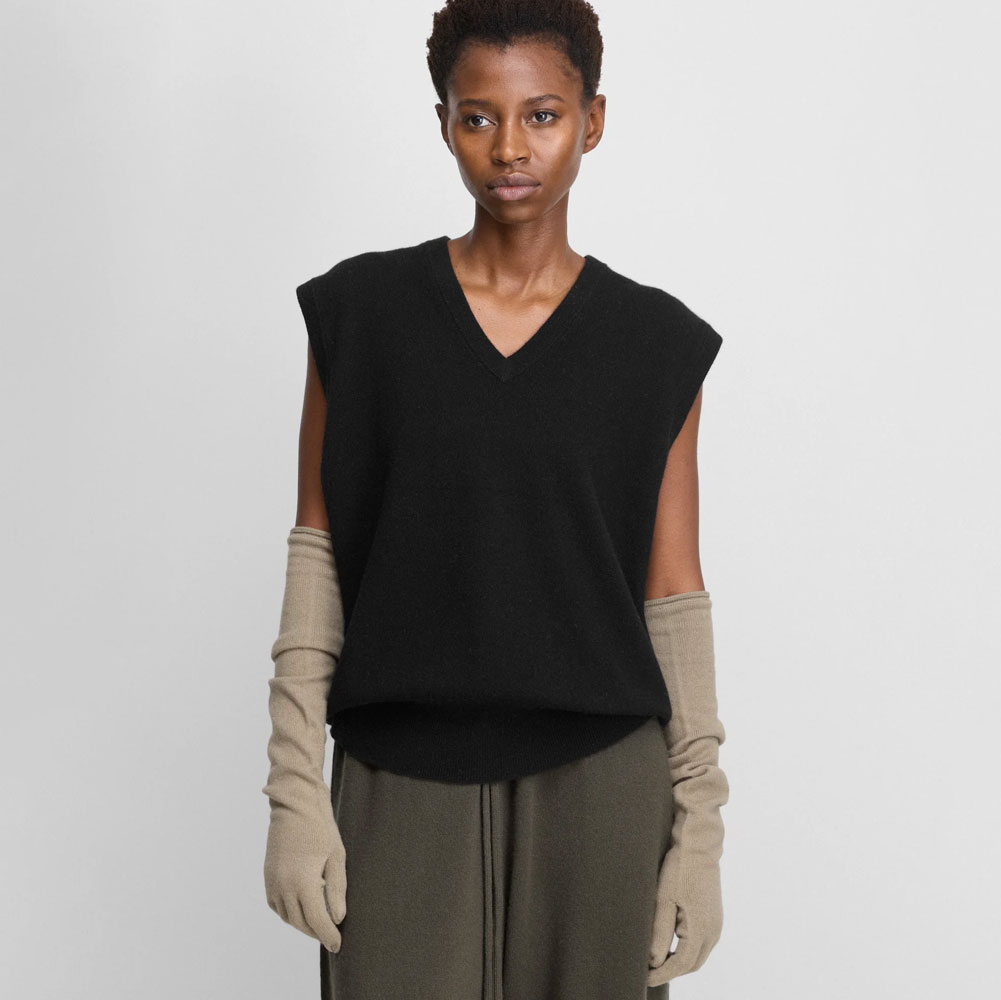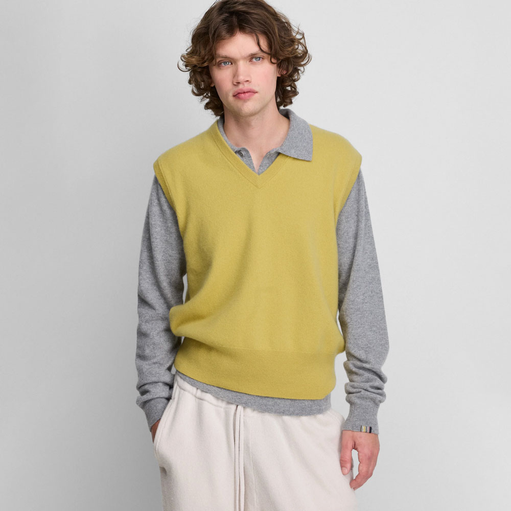 クラシックなカシミアのVネックセーター。ワードローブの定番として幅広いシーズンに活躍するアイテム。リラックスフィット。