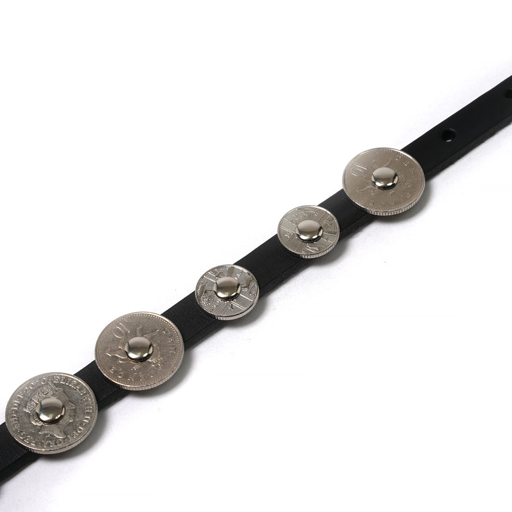 細身の12mm幅レザーに連なるコインディテールが、動きに合わせて立体的な表情を生み出します。