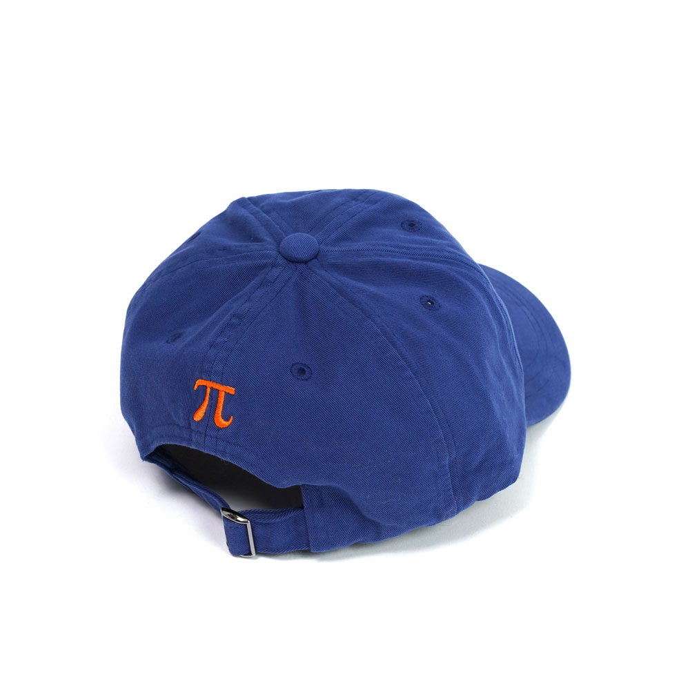 ネイビーにオレンジのロゴ刺繍が映える6パネルキャップ。
