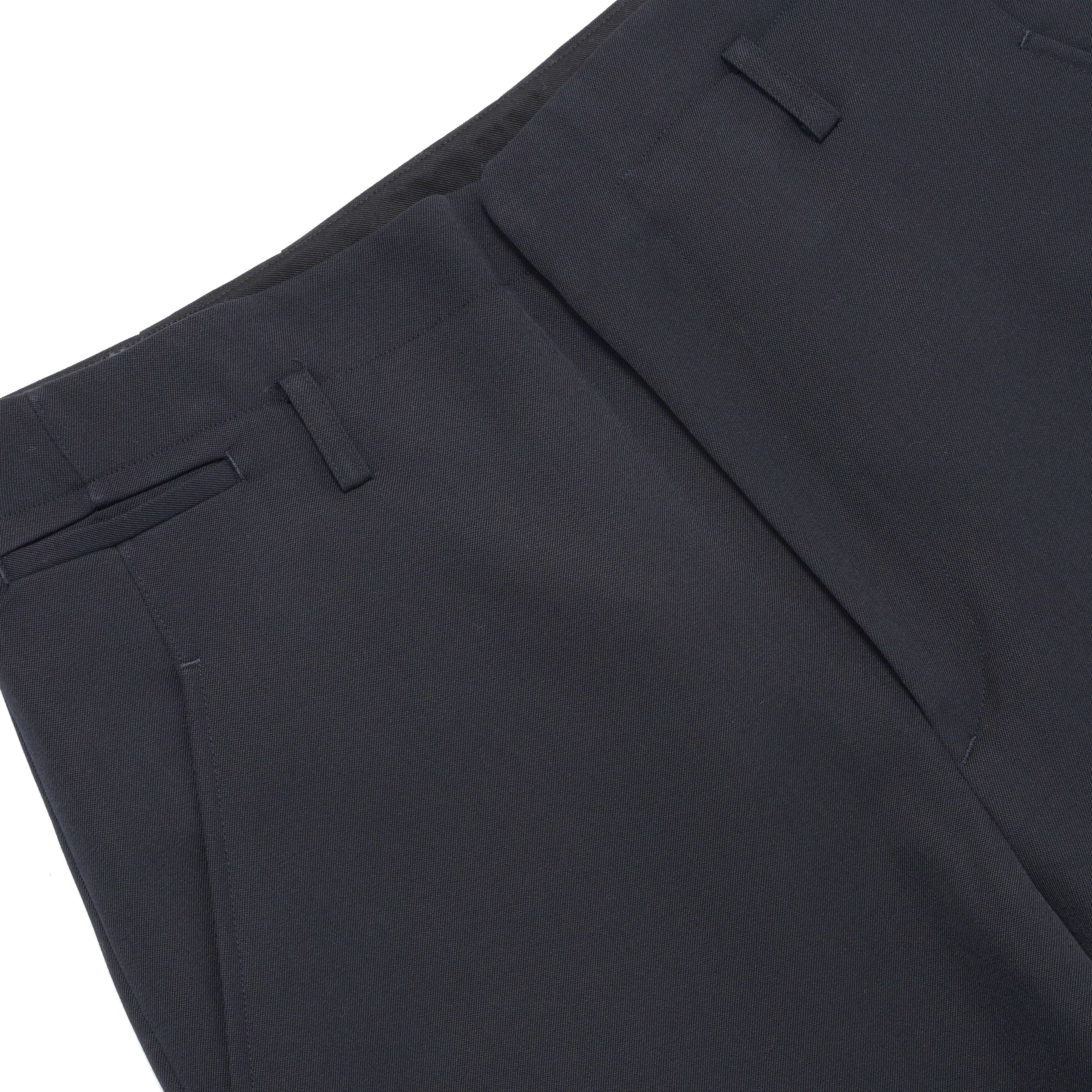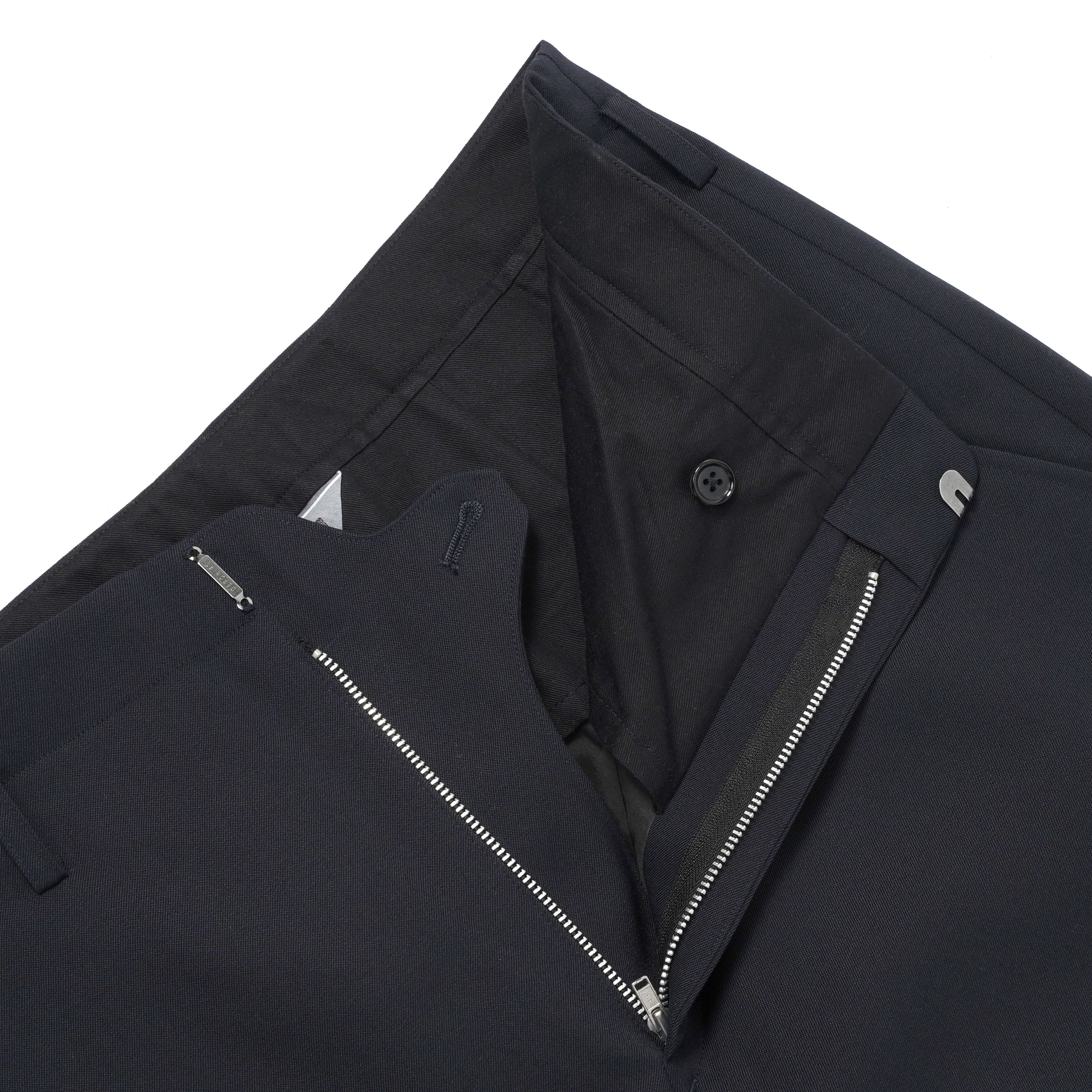 上質なウールギャバジンを使用したトラウザーパンツ。ワイドストレートながら、軽やかなテーパードシルエットで仕上げ、ウエストのベルトループやバックポケットなど細部まで作り込まれたディテールが魅力の一本です。