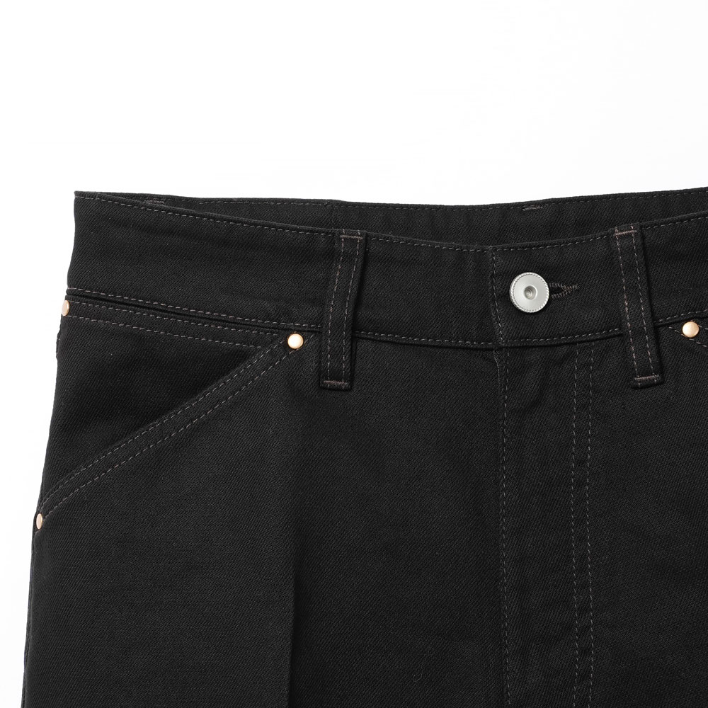 中厚手のブラックデニム素材を使用し、9分丈仕様のすっきりとしたレングスと、綺麗なストレートレッグが特徴です。ワードローブに欠かせない定番アイテムとして、日常のスタイリングに取り入れやすい一本に仕上げられています。