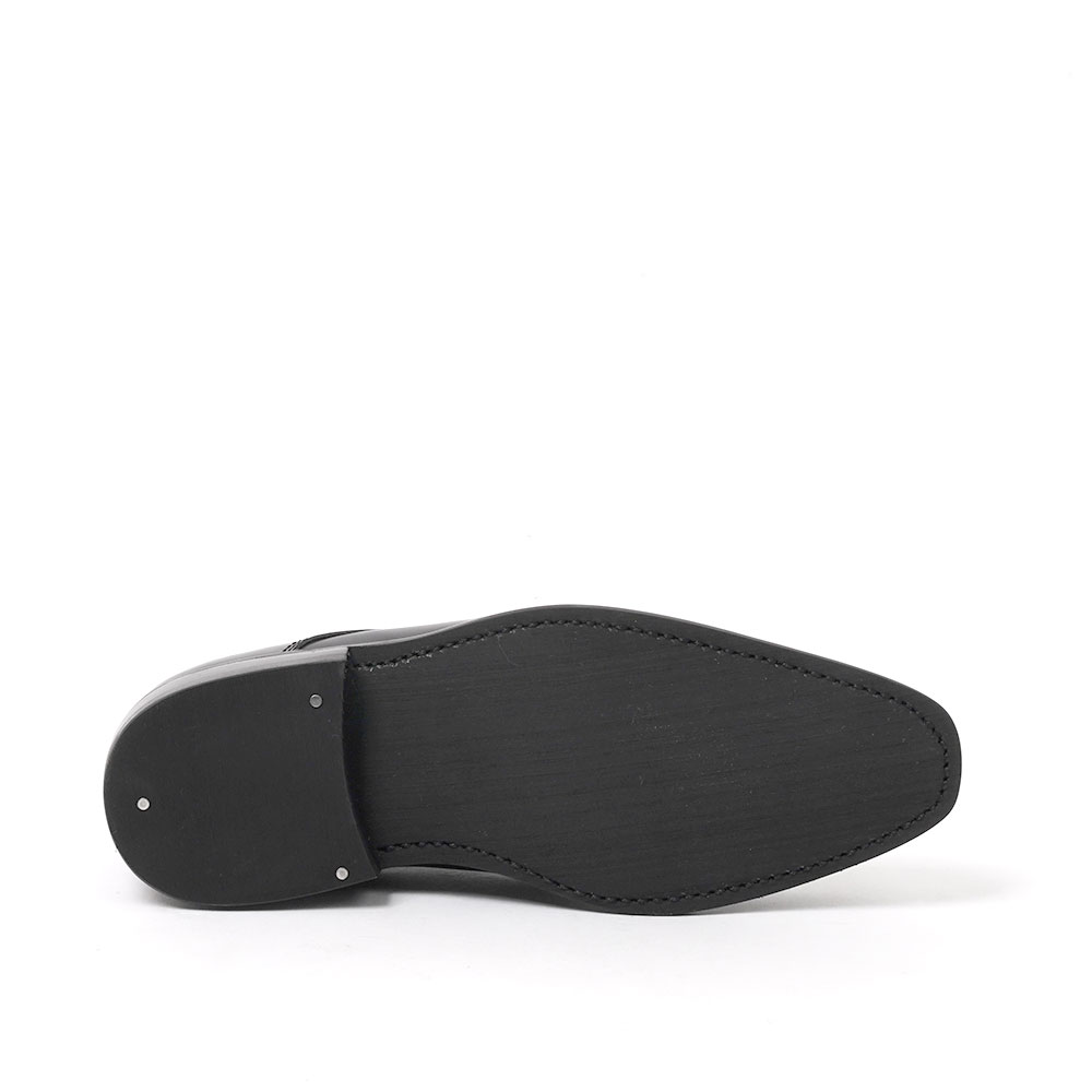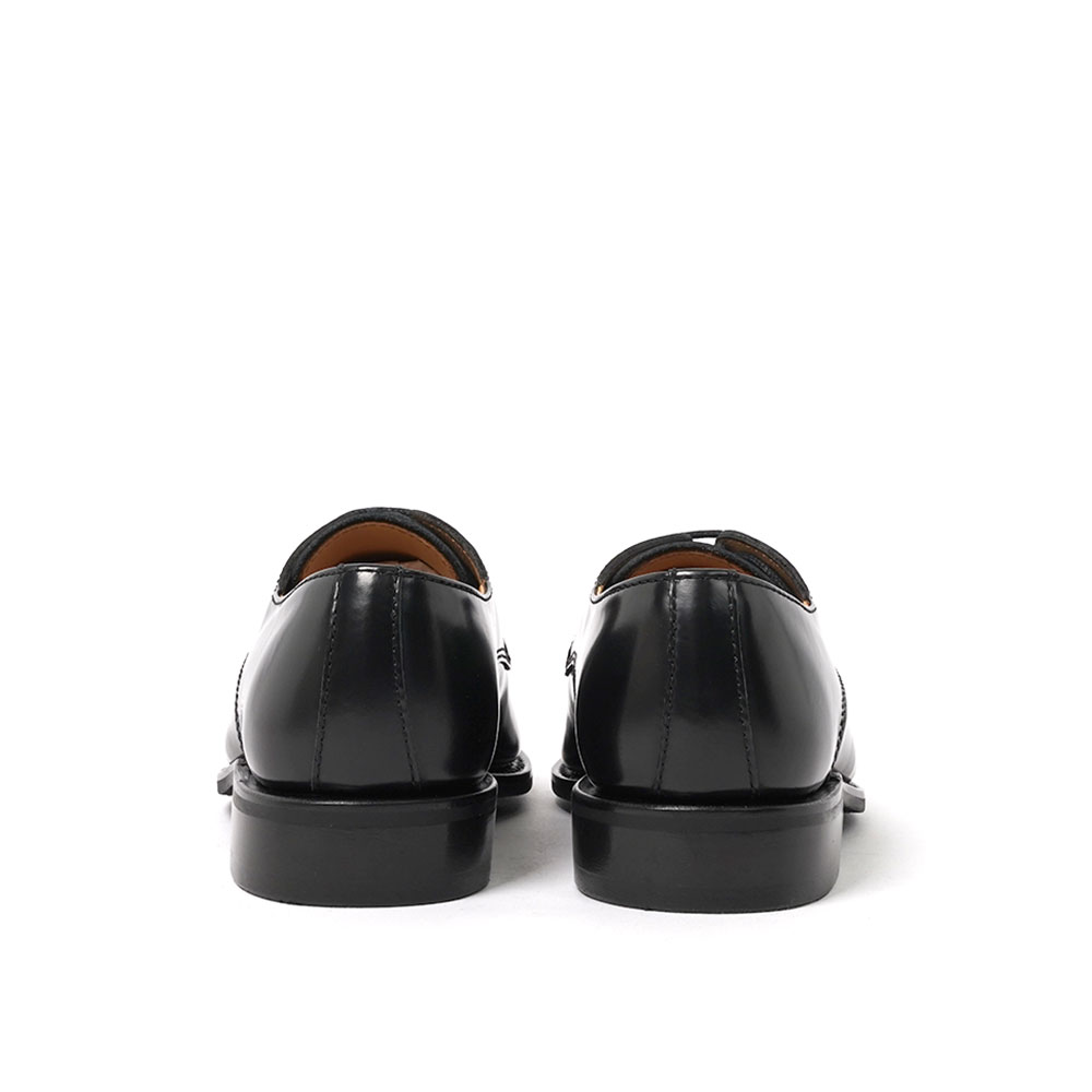 ポルトガル製のカウレザーにグレーズド加工を施したレザーシューズ。艶やかなブラックレザーが、洗練された存在感を放ちます。新たに設計されたラストを採用し、シャープさと程よい丸みを併せ持つポインテッドかつブランテッドなトゥシェイプが特徴。アッパーには外側に表出したシームディテールをあしらい、構築的な印象を強調しています。ソールにはグッドイヤーウェルト製法を採用。耐久性と安定感に優れ、履き込むほどに足に馴染む一足です。クラシックな佇まいの中に、ブランドならではのモダンなエッセンスを落とし込んだシューズとなっています。