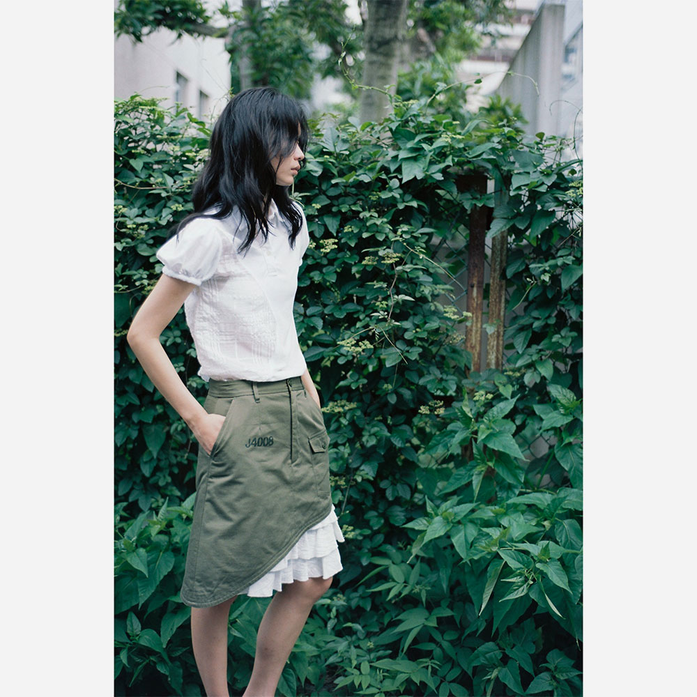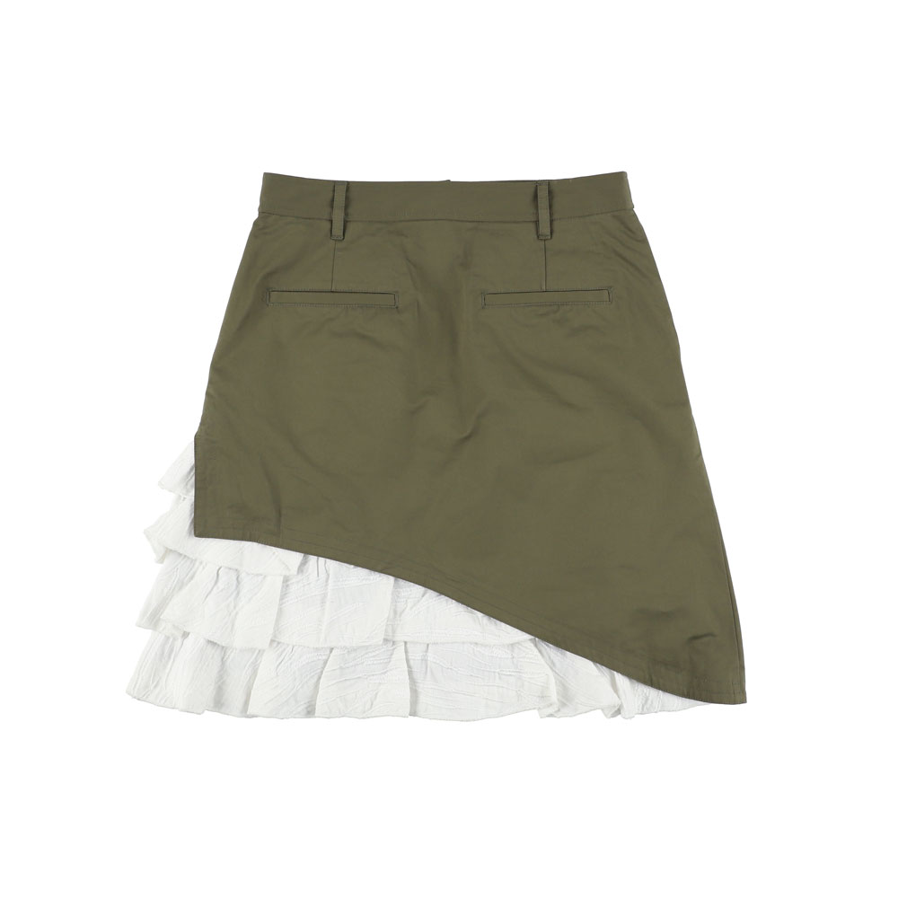 ミリタリーディテールを基調に再構築したアシンメトリースカート。フロントにはフラップ付きカーゴポケット。ウエストからヒップにかけてはすっきりとしたラインで構築されています。裾部分には段状に重ねた立体的なゼブラ柄のフリルをドッキング。オリーブのミリタリー素材と、軽やかなホワイトテキスタイルとのコントラスト◎