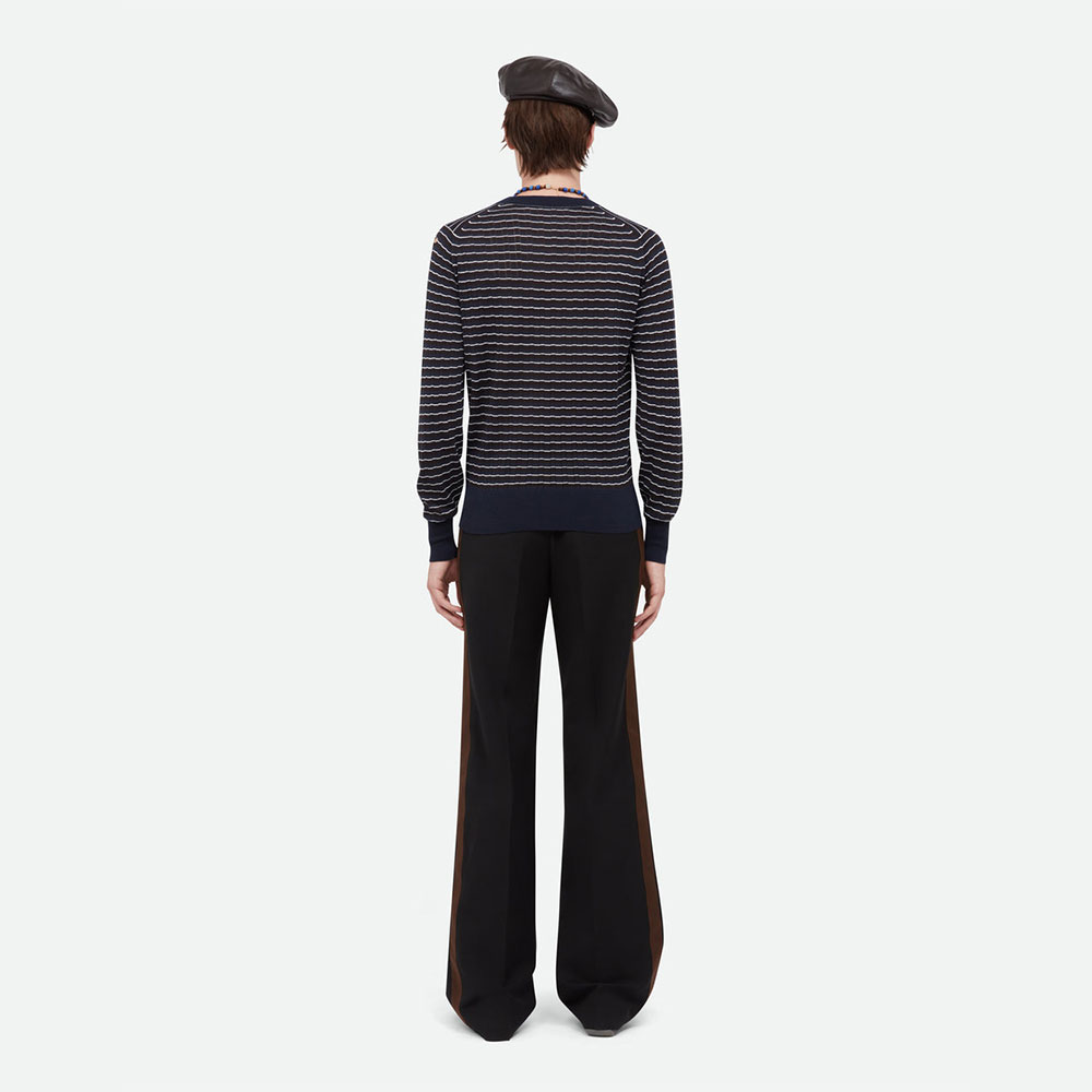 上質なウールを使用したポイントルニットは、繊細な透かし編みが特徴的。ネイビー、ダークブラウン、アイボリーの洗練されたカラーパレットが、品のあるレイヤードスタイルを演出します。