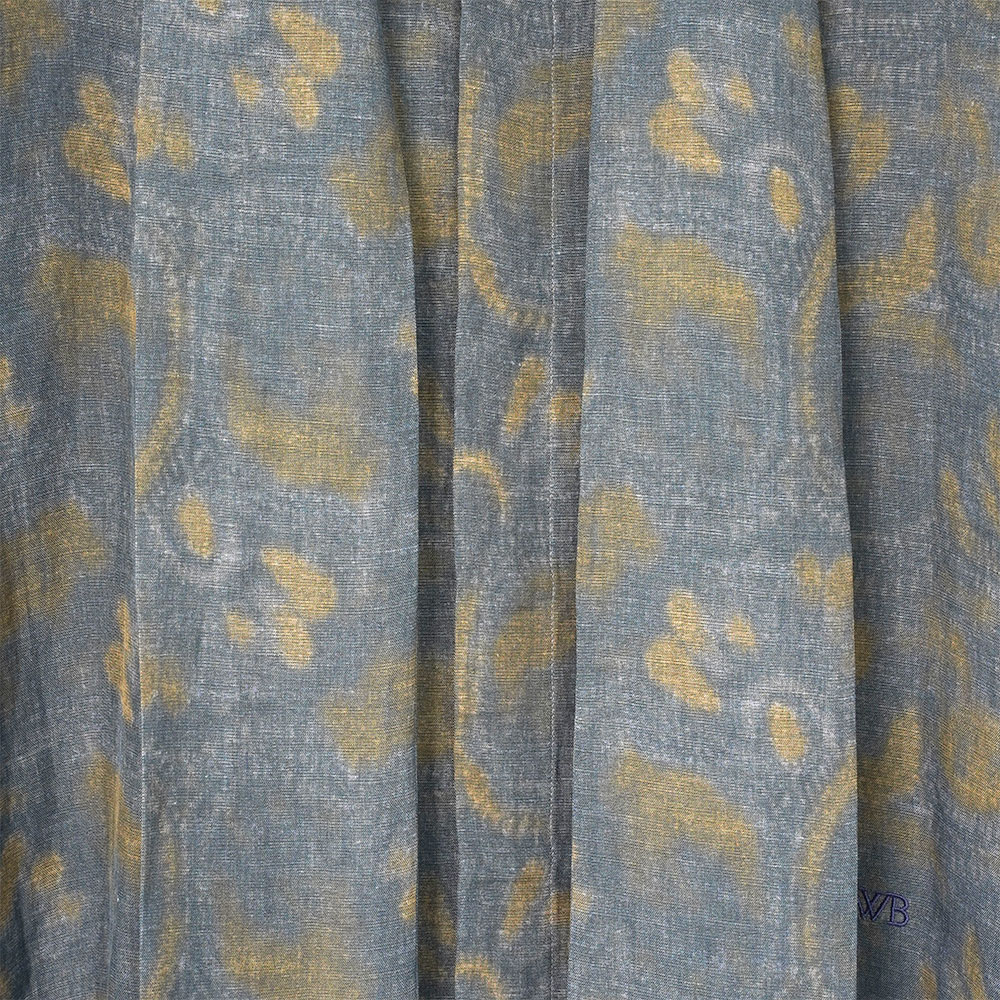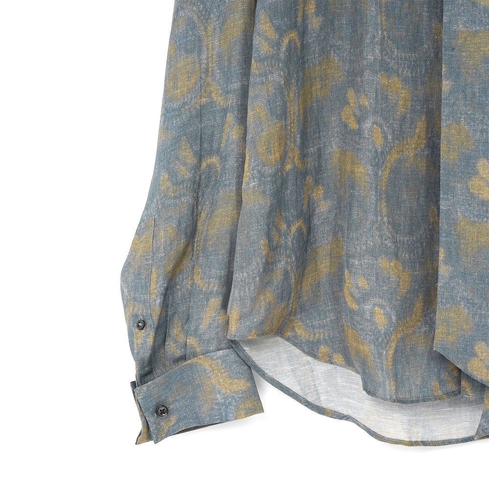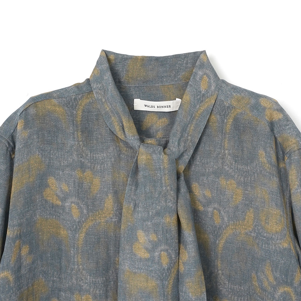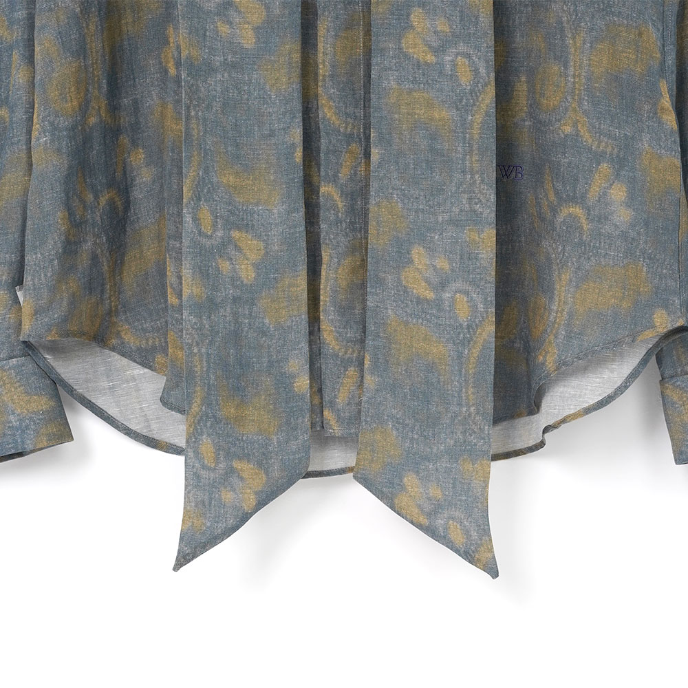 エレガントな佇まいが印象的なボウタイシャツ。今季を象徴するロータス(蓮)モチーフを、インディゴとオリーブのニュアンスカラーで表現しました。リラックス感のあるビスコースリネン素材を使用し、かすかな光沢感と透け感のしなやかな風合いに仕上げています。