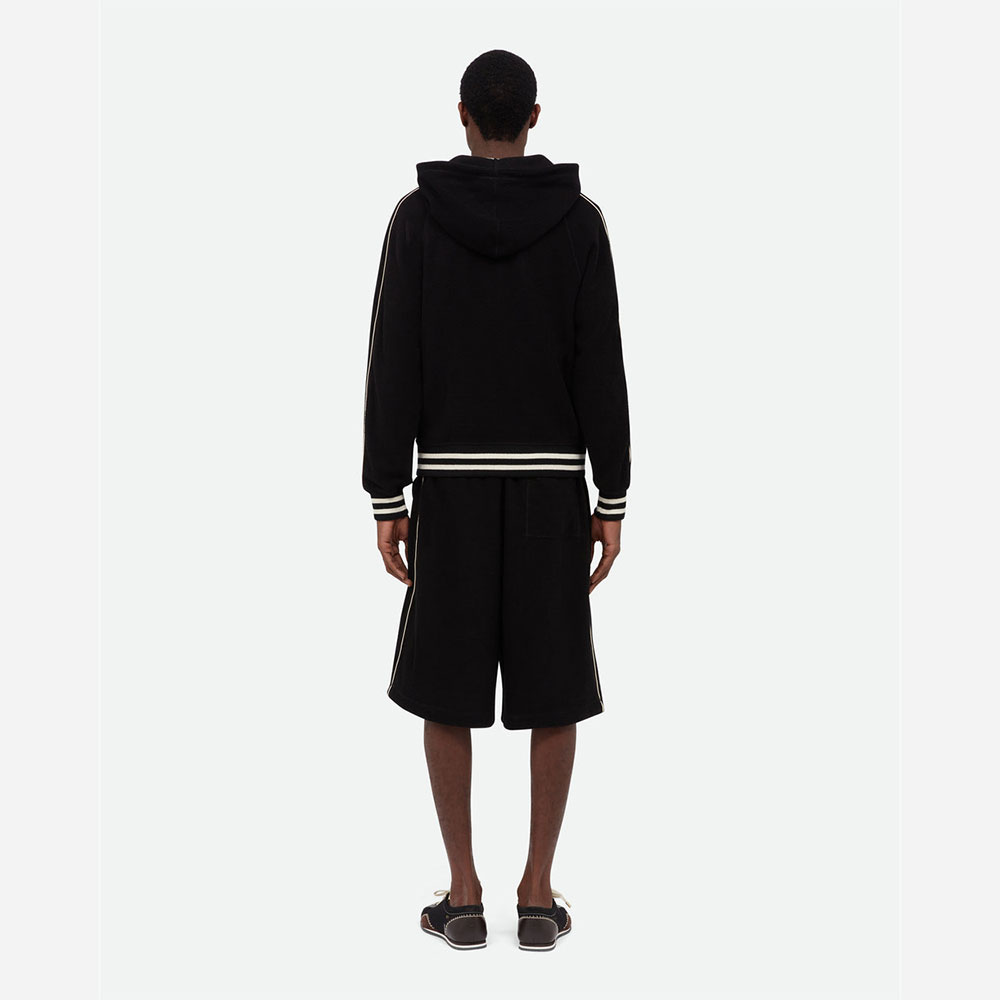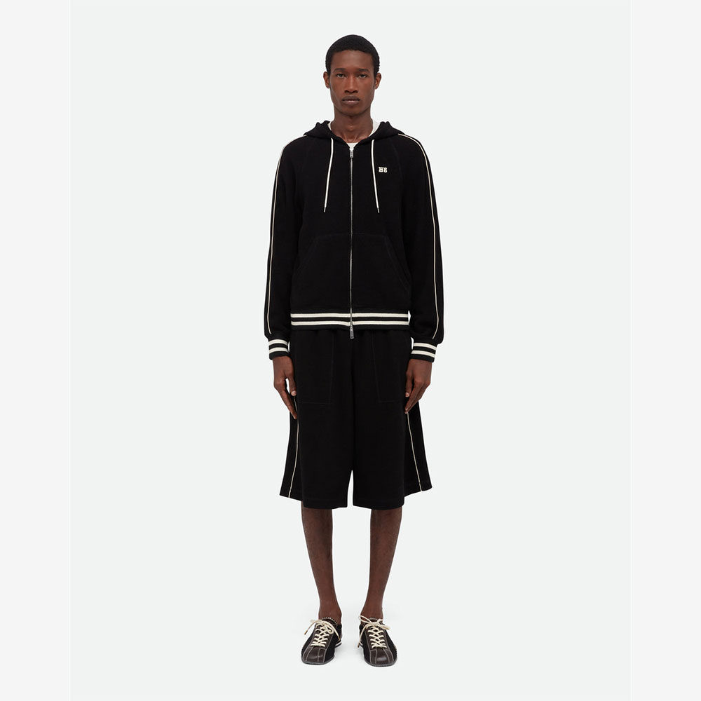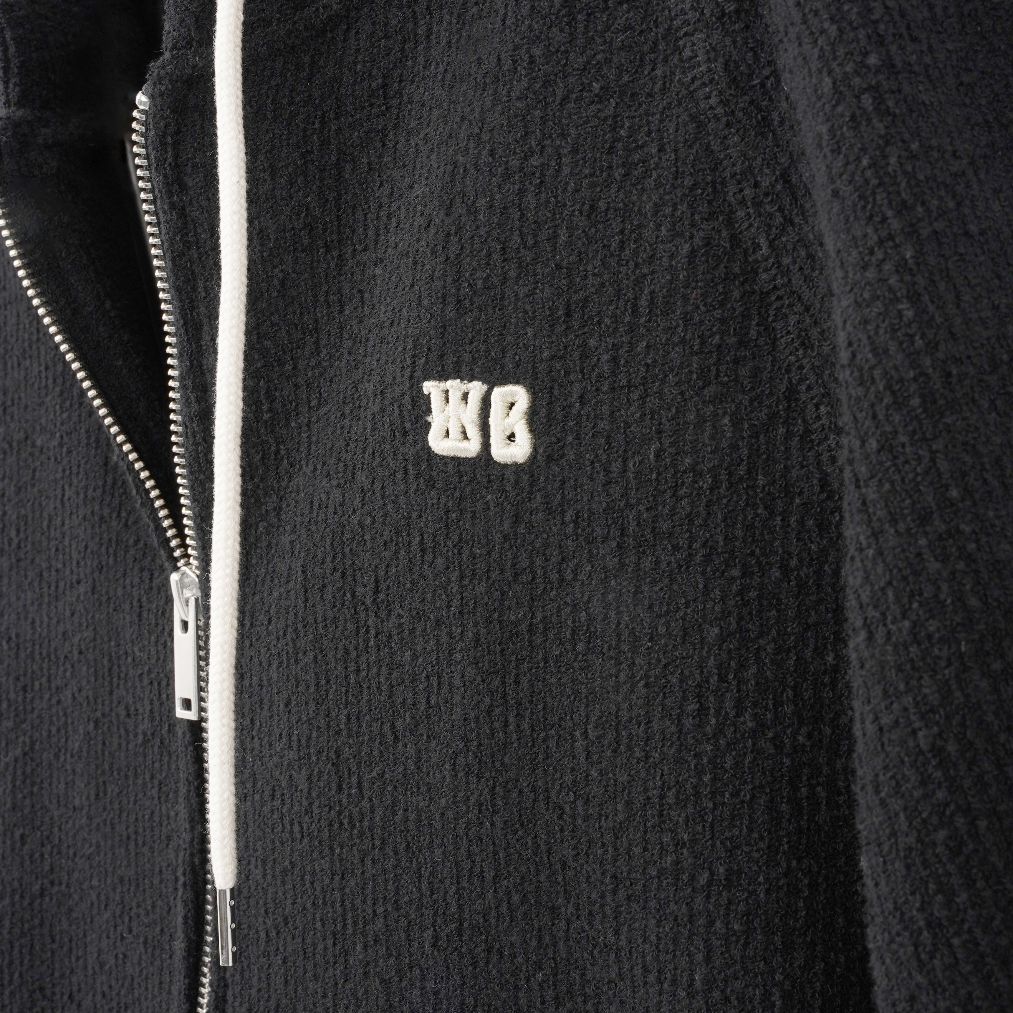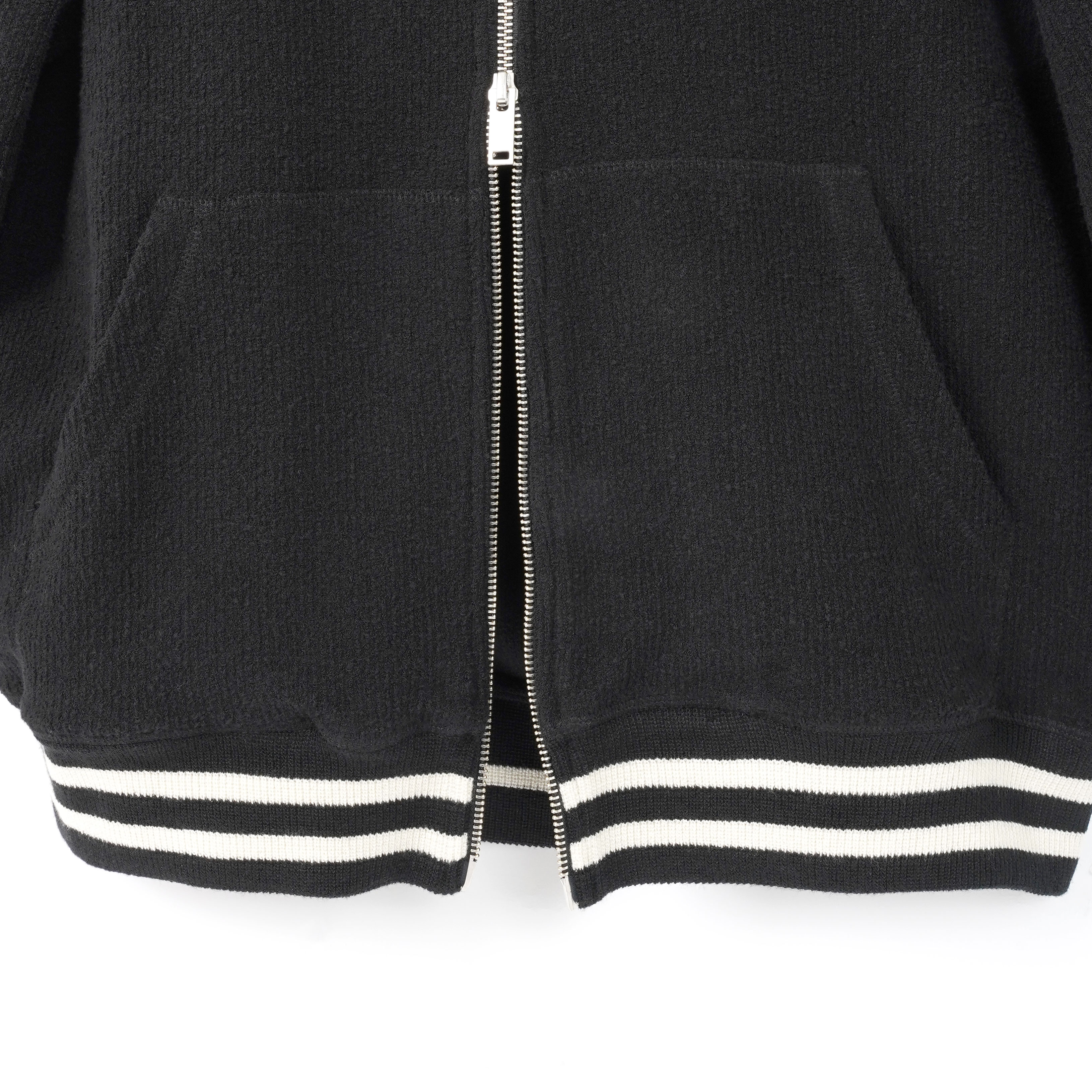 パーカーのリラックスしたシルエットとニットならではの滑らかな肌触りを両立。深めのフードとドローストリングが、都会的でモダンなムードを演出します。