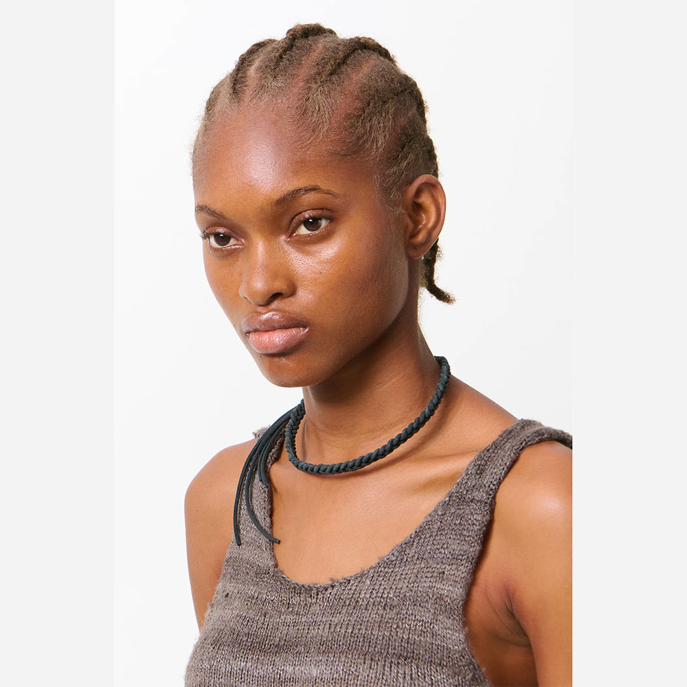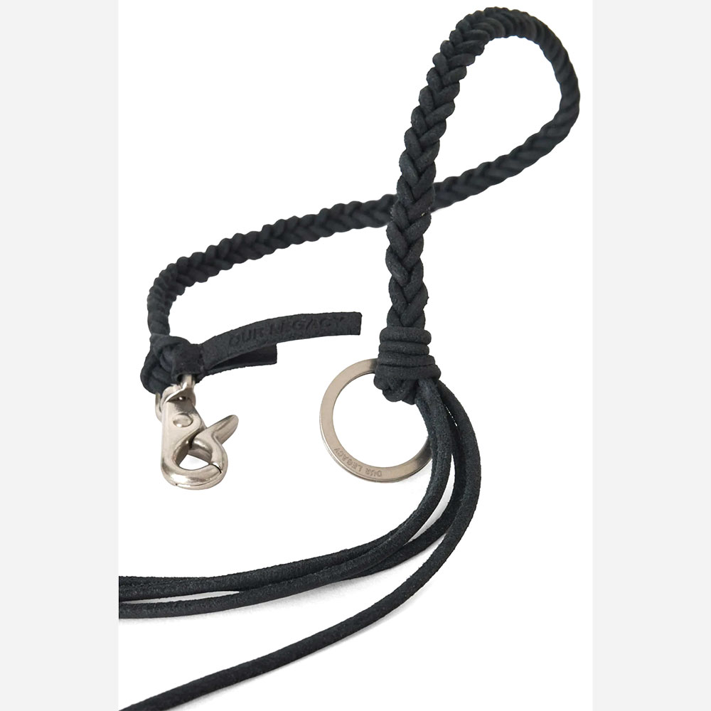編み込みのレザーコードに、OUR LEGACYの刻印を施した日本製メタルのWリング、手縫いのレザータブを組み合わせています。