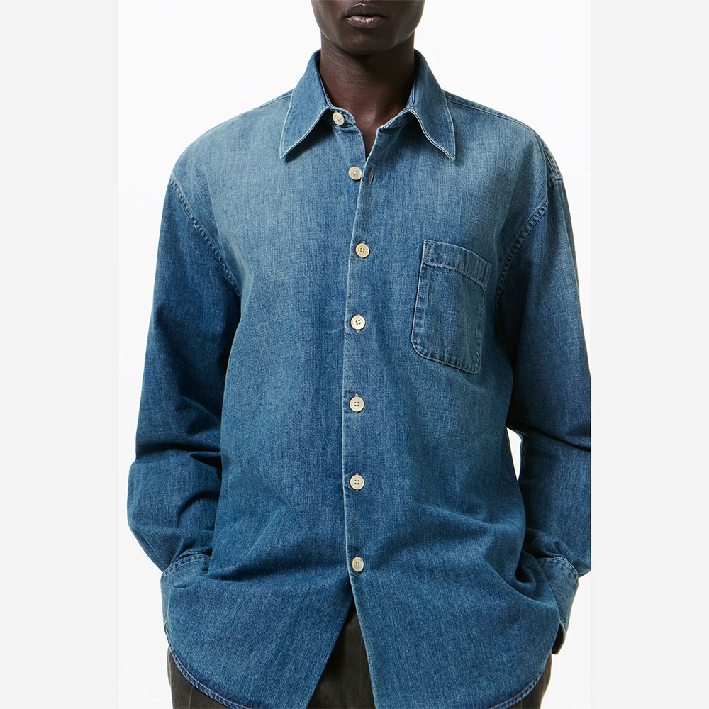 ややオーバーサイズのシルエットで、シングルチェストポケット、真珠貝ボタン、カーブドヘム、マイタードカフスを備えています。