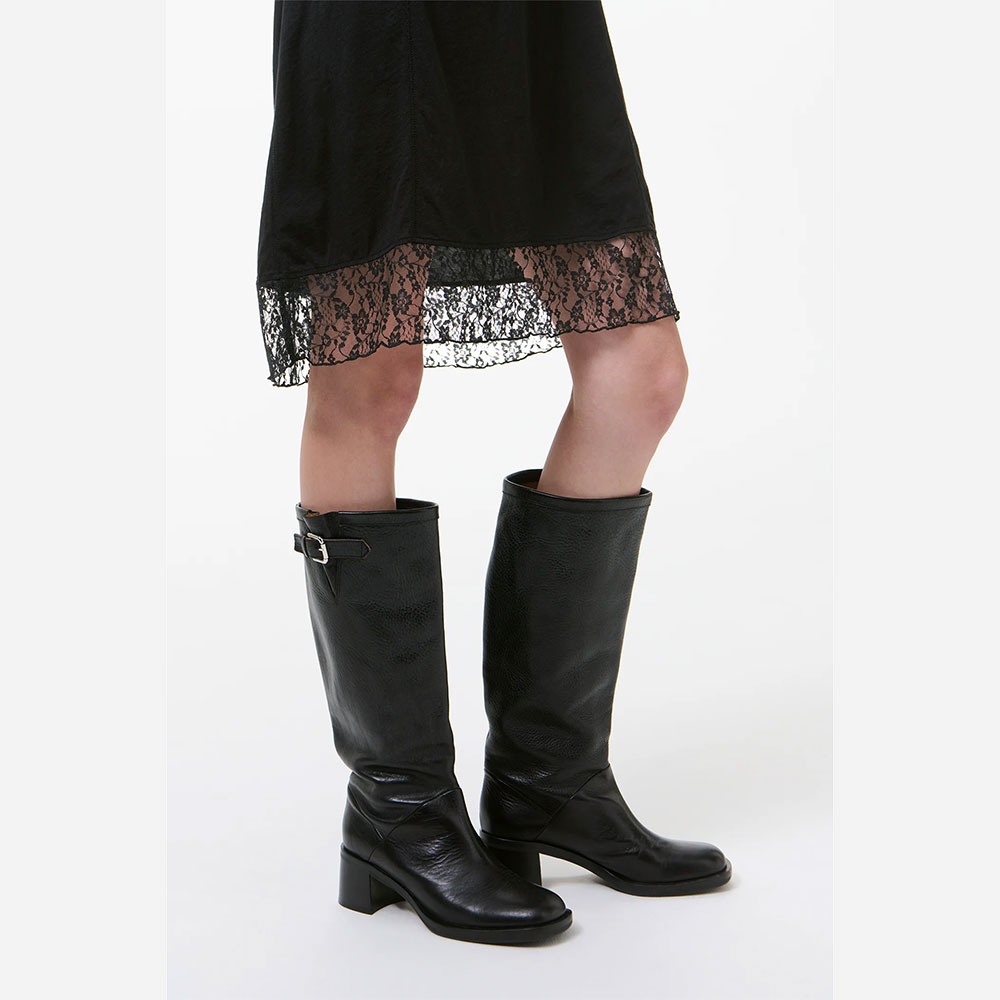 ロング丈のボディに、コントラストの効いた長めのボトムパネルを組み合わせ、優しく広がるAラインシルエットを構築。フロントネックラインには斜めダーツを施し、立体的な表情を加えています。